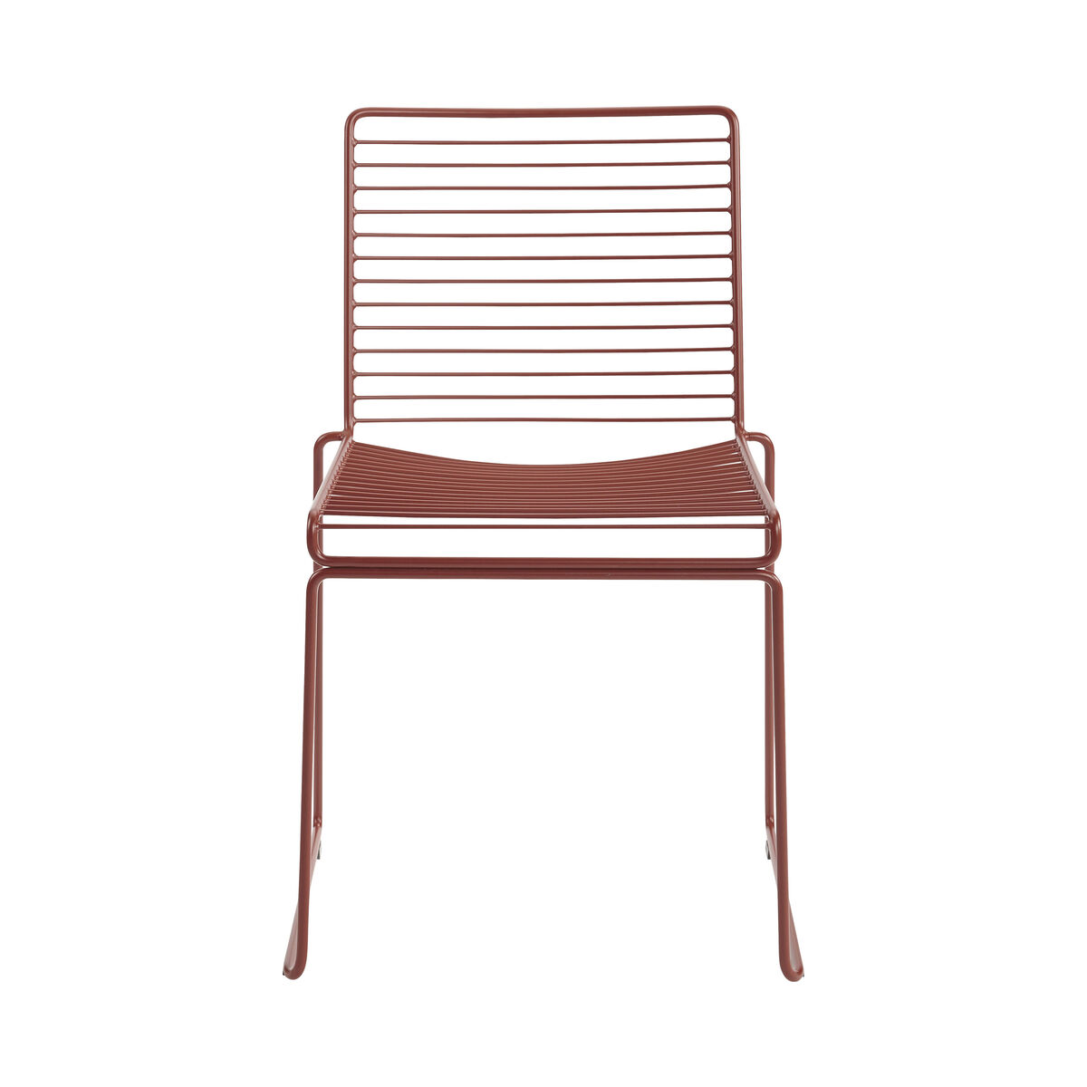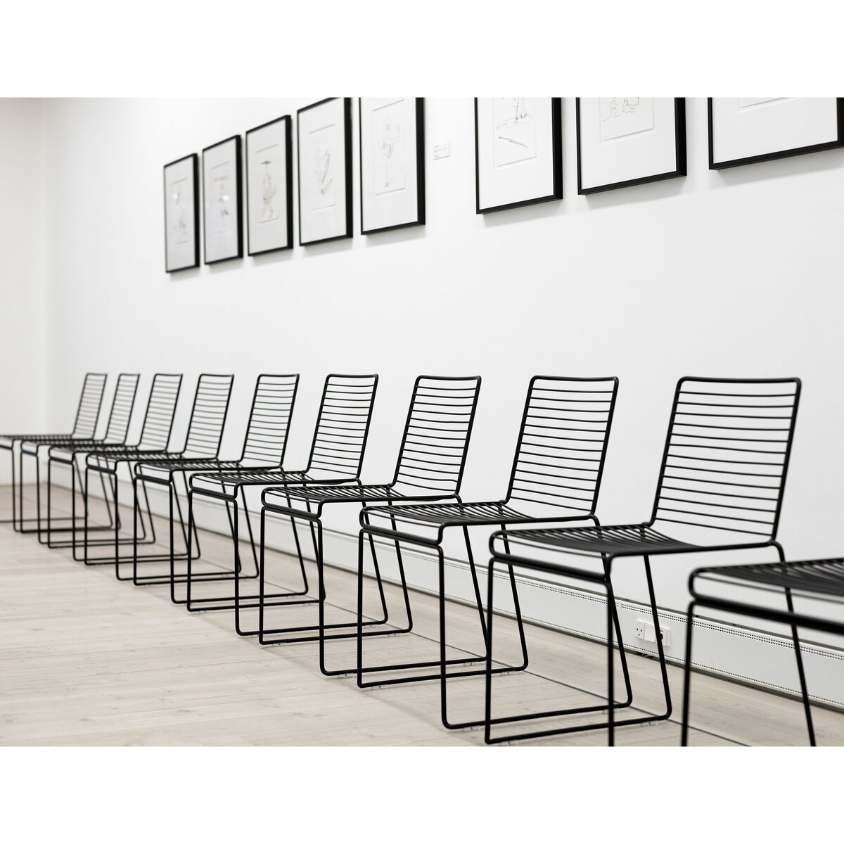 The idea for the Hee chairs derives from an ambition to make an eco-friendly chair where the materials are easily recyclable. Creating a chair from one single material has the environmental advantages of saving transportation between different production sites and simplifying the recycling of materials. The philosophy was taking an archetyppical chair and perfecting it in every single detail by lifting the design up a level, simplifying it and improving the usability. The starting point was to make a cool and basic chair that would fit most locations, modern but not so typical of the period, that it does not have a long life. There is nothing superfluous or ornamented about the chair and nothing can be removed without losing the function. The chair has a playful expression but does not let the design compromise its purpose. The mentality of using-and-throwing-away is not in harmony with the environmental ambition. Balancing the construction was essential, as was combining aesthetics and function by finding exactly the right thickness of the metal wire. The chair is made from 11 mm metal wire and the form refers to a sketch, a pencil drawing in three dimensions. The Hee collection comes as a chair, a low armchair and a bar stool. It is, among other places being used in the new Oslo Opera and the Australian parliament. Hee is stackable and electroplated prior to the powder coating, and they withstand weather throughout the year making it suitable for an outdoor set up.