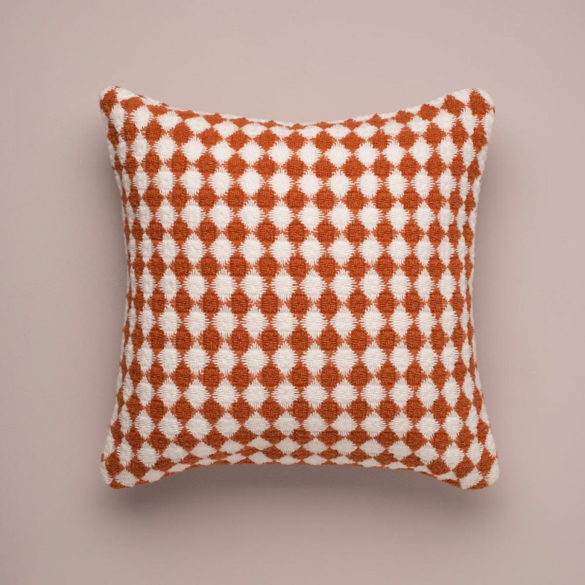 - Knitted Diamond Check- Cotton and Recycled Polyester- Playful Pop of Colour- Matching Throws Available. Heera, meaning diamond in Hindi, is a tribute to its Indian heritage. This collection of exquisitely soft knitted cushions and throws is thoughtfully designed to infuse your home with both colour and comfort. Available in three vibrant shades: ginger, fern, and ash rose. Mix and match them to create a warm and inviting space.