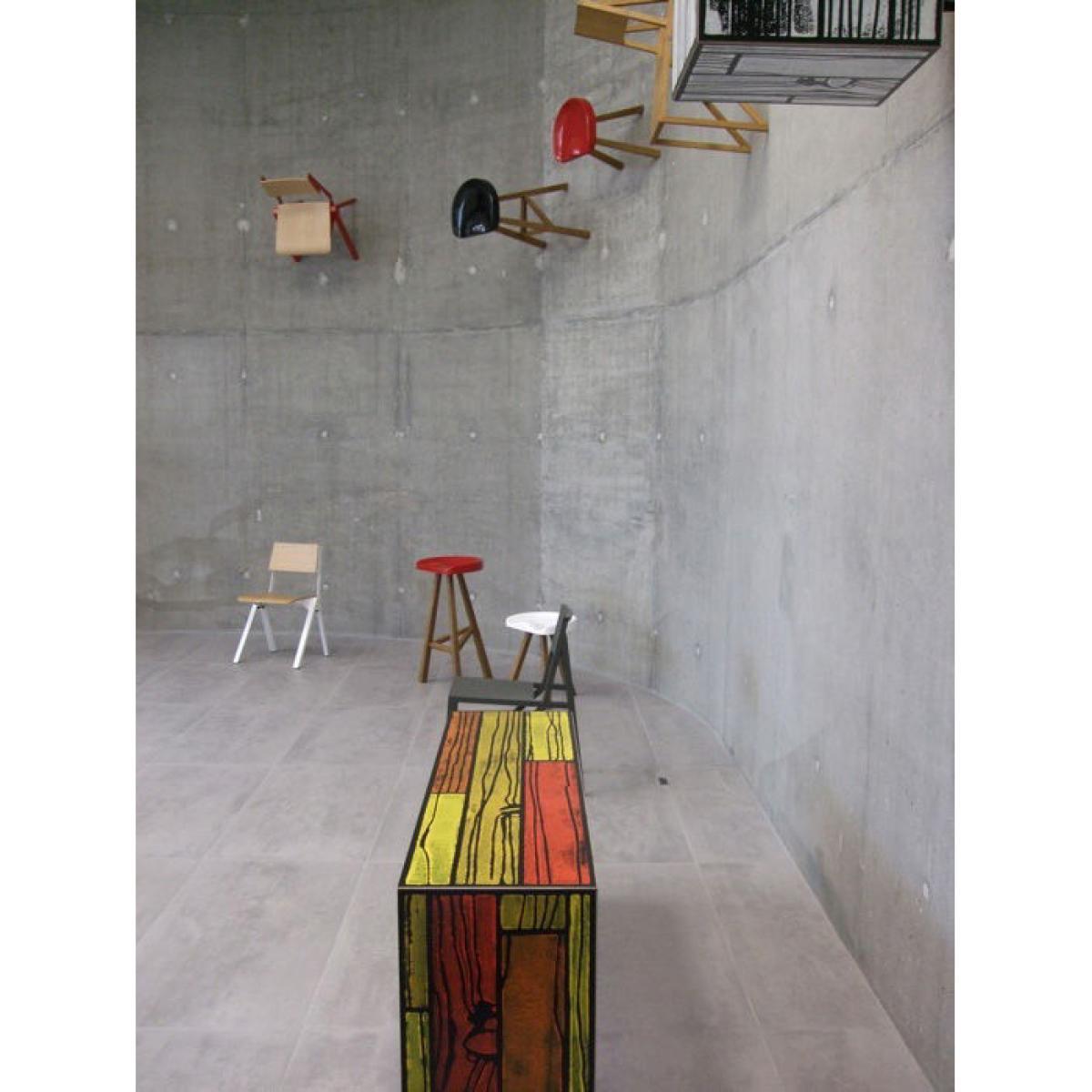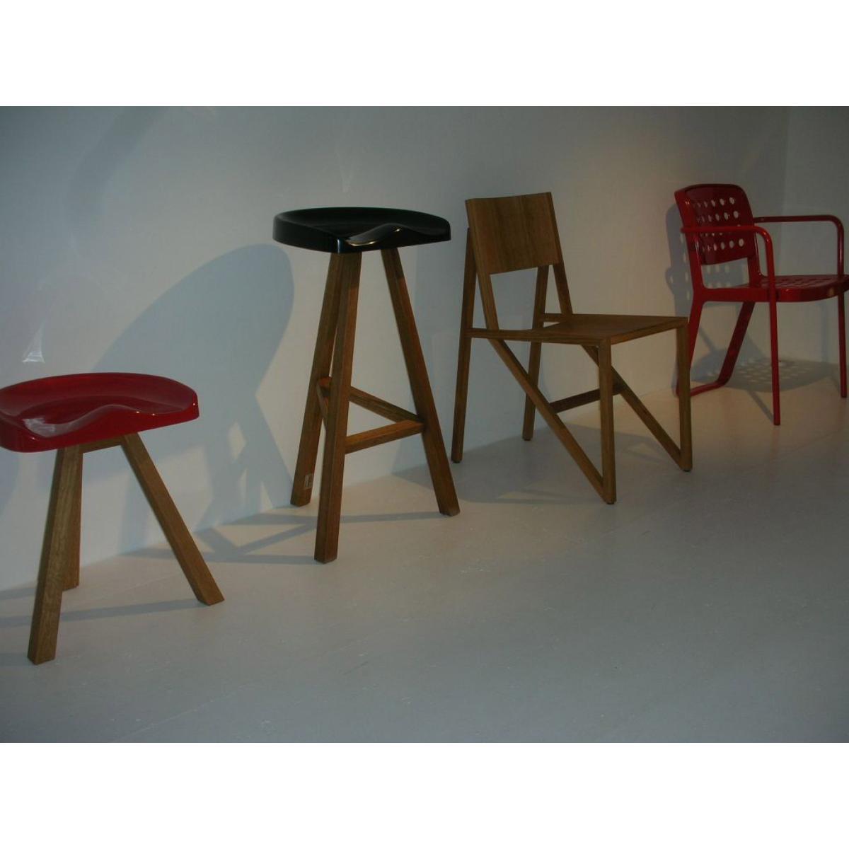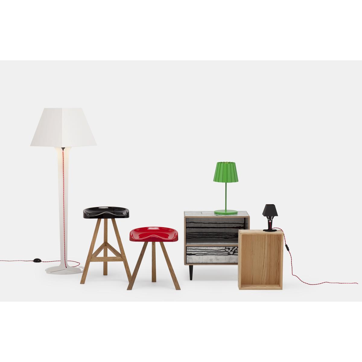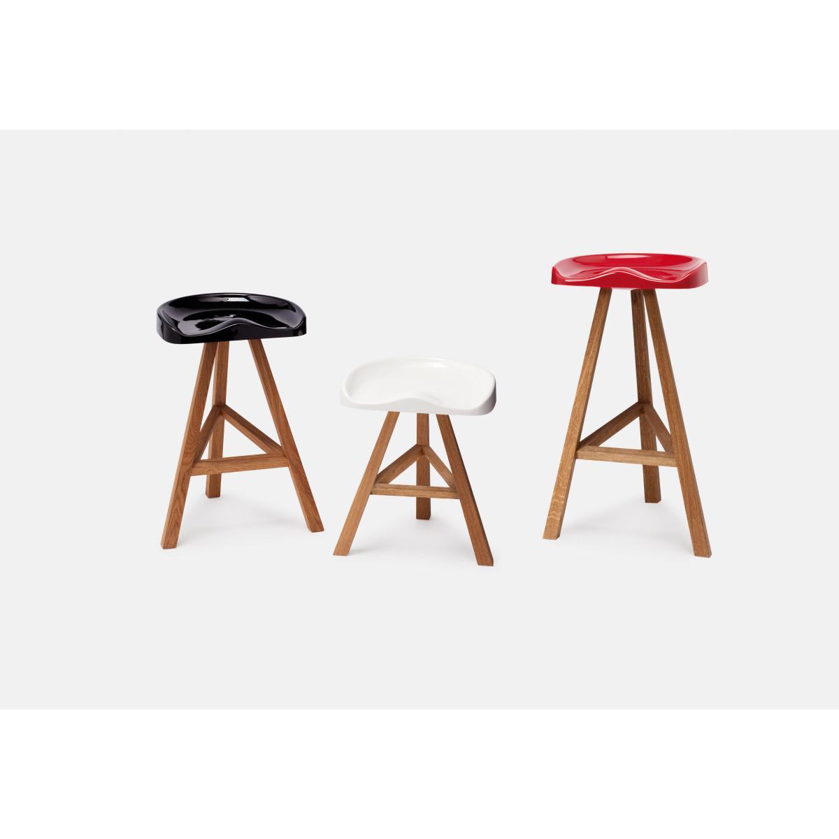 This stool design is a consideration of the basic simplicity of form and function. Two archetypal seating solutions are combined: a classic tractor seat, chosen for its ergonomic shape, sits on top of a rustic, three-legged milking stool. The generously proportioned seat is designed for comfort and is made from colour gel coated polyester resin. The material chosen is tactile and contemporary and is intended to express modernity. The elegantly tapered legs are oiled European oak. Their simple, geometric form is in contrast to the fluid mass of the seat they support. Heidi stool is available in three heights with the option of a red, white or black seat.