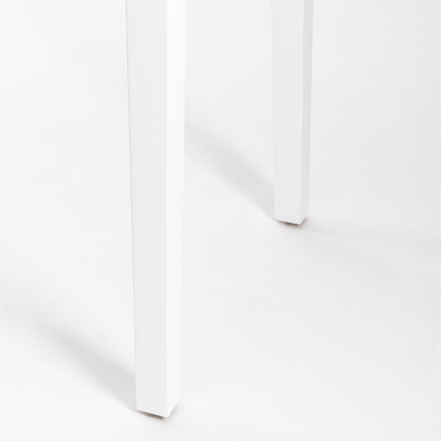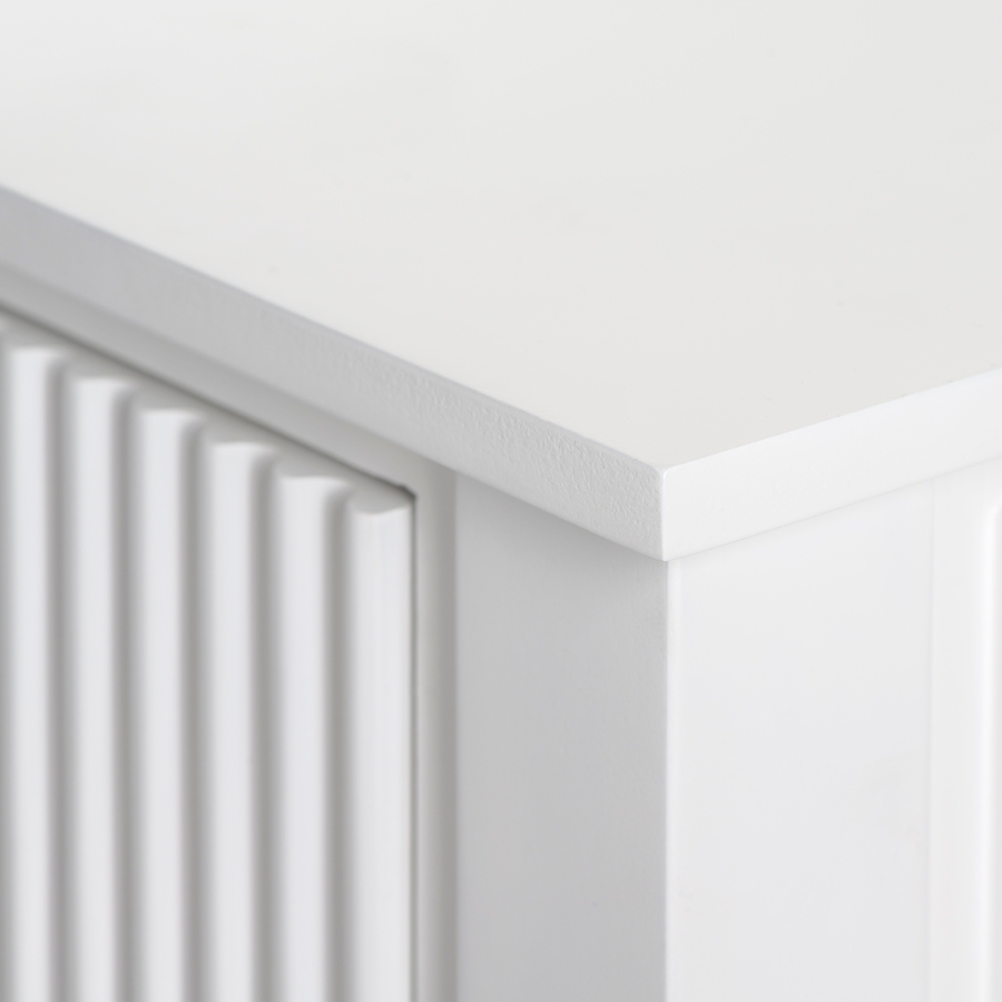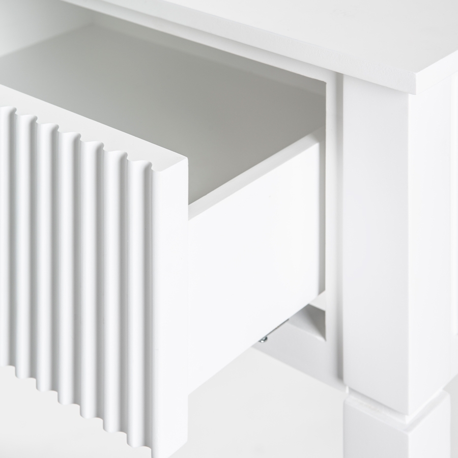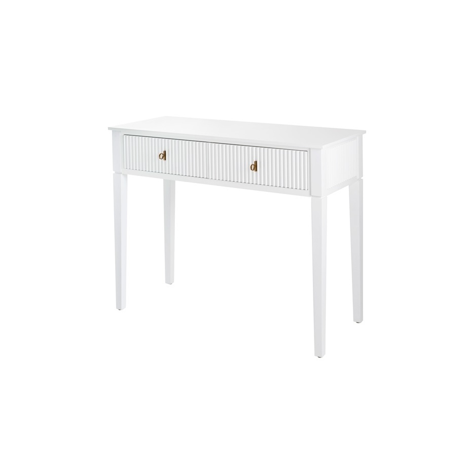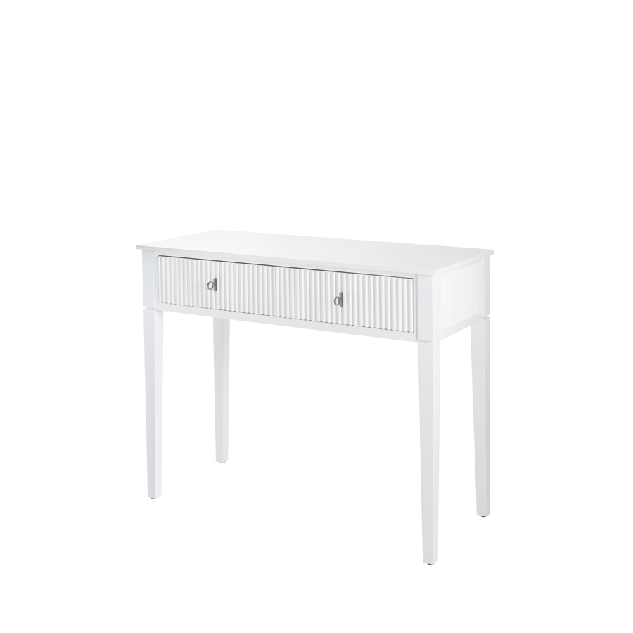 An elegant, feminine console table. Suitable for use as a dressing table. Reeding detail to front drawers and side panels. Durable white polyurethane paint finish. A distinctive, delicate handle supplied in both brass and silver allowing for customisation. Assembly Required.
