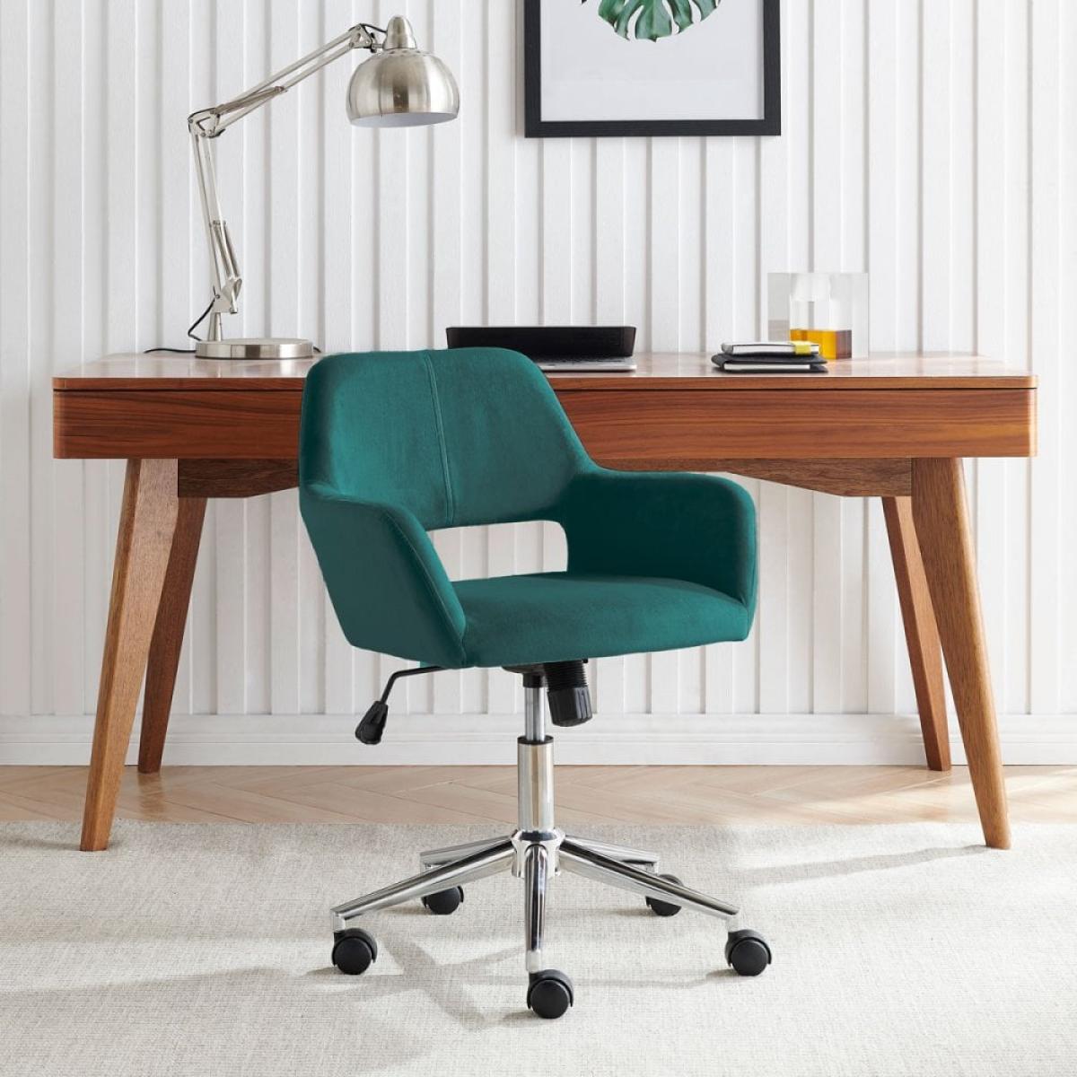 I love this teal velvet office chair for its vibrant colour and tactile richness, which instantly elevates any workspace. It works particularly well in interiors that blend modern and eclectic styles, adding a pop of colour without overwhelming the space. For styling tips, pair it with sleek white or neutral-toned desks to let the chair be the statement piece, or combine it with brass or black accents for a more sophisticated look. Its plush fabric also offers added comfort, making it practical for long work sessions, while its contemporary silhouette means it can easily transition from a home office to a creative studio.