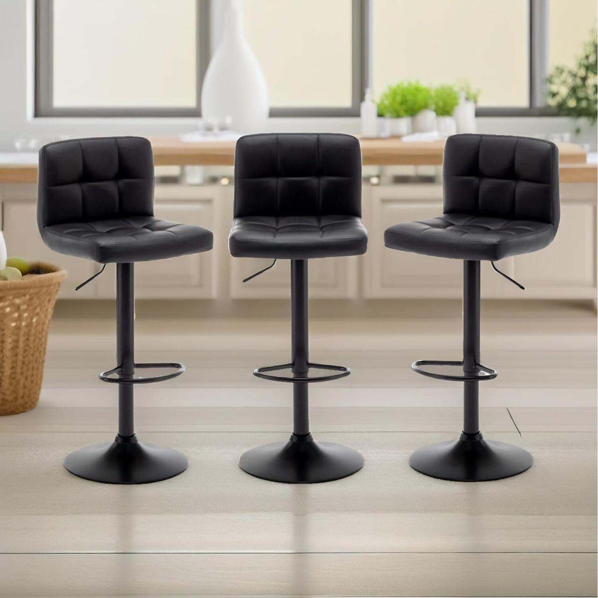 Make a statement with these bar stools, crafted from luxurious faux leather that exudes sleek and chic sophistication. Featuring a plush seat upholstered in faux leather, these set of 3 stools boast a sturdy black steel base, footrest, and frame for lasting durability. Effortlessly adjust the height of the stool with the gas lift mechanism, providing convenience and versatility for various seating preferences. With the ability to hold up to 100kg, these stools offer reliable support for users of various sizes. Assembly is a breeze, with the stool easily put together in minutes. The easy-to-clean faux leather seat ensures hassle-free maintenance, keeping your stools looking pristine for years to come.