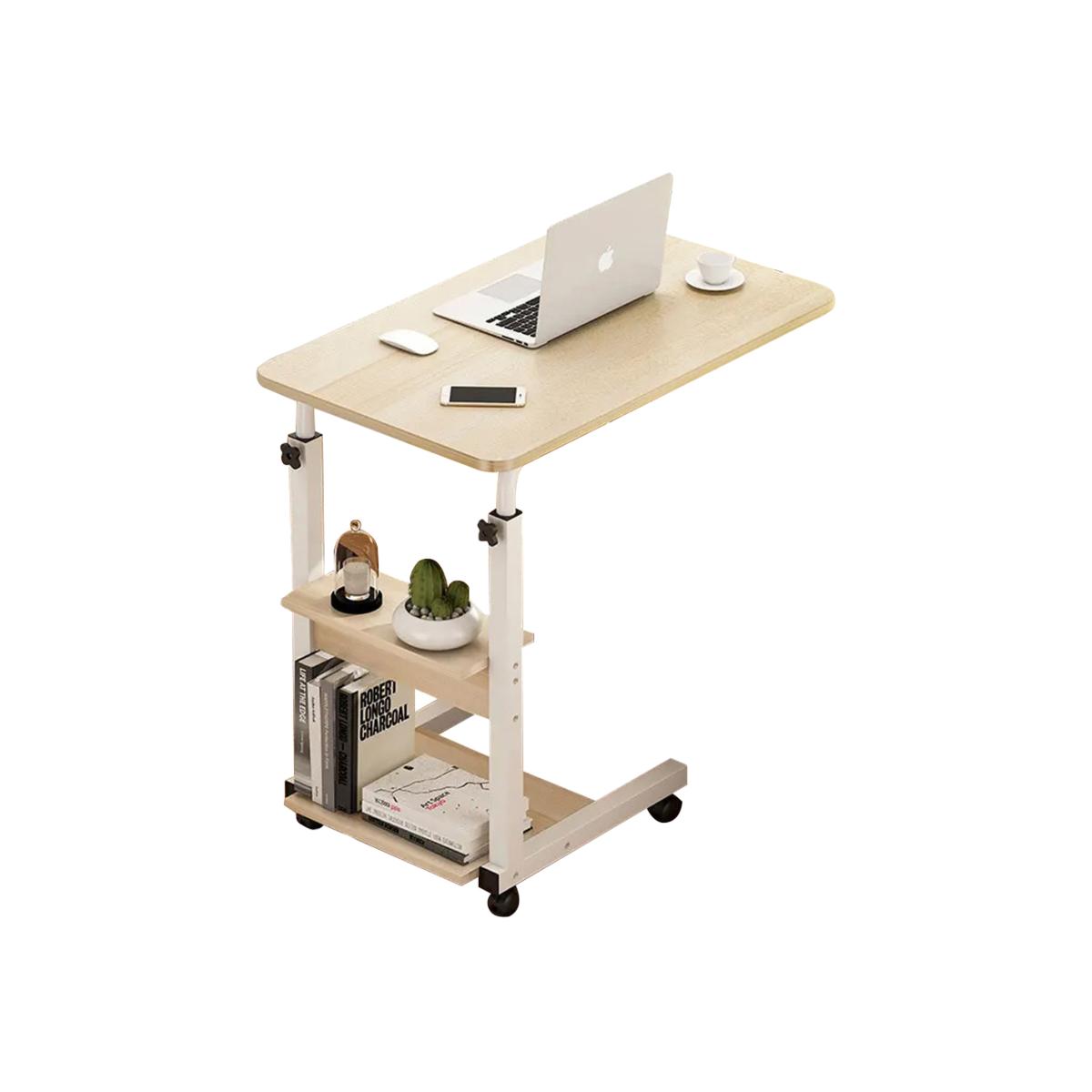 This mobile desk features a simple design with soft tones to suit any room. The three tier layout provides a desktop and two shelves for tidy storage. The C shaped frame slides easily under beds or sofas for comfort. Height can be adjusted to meet different needs. It works well as a computer desk, study desk, or dining table.