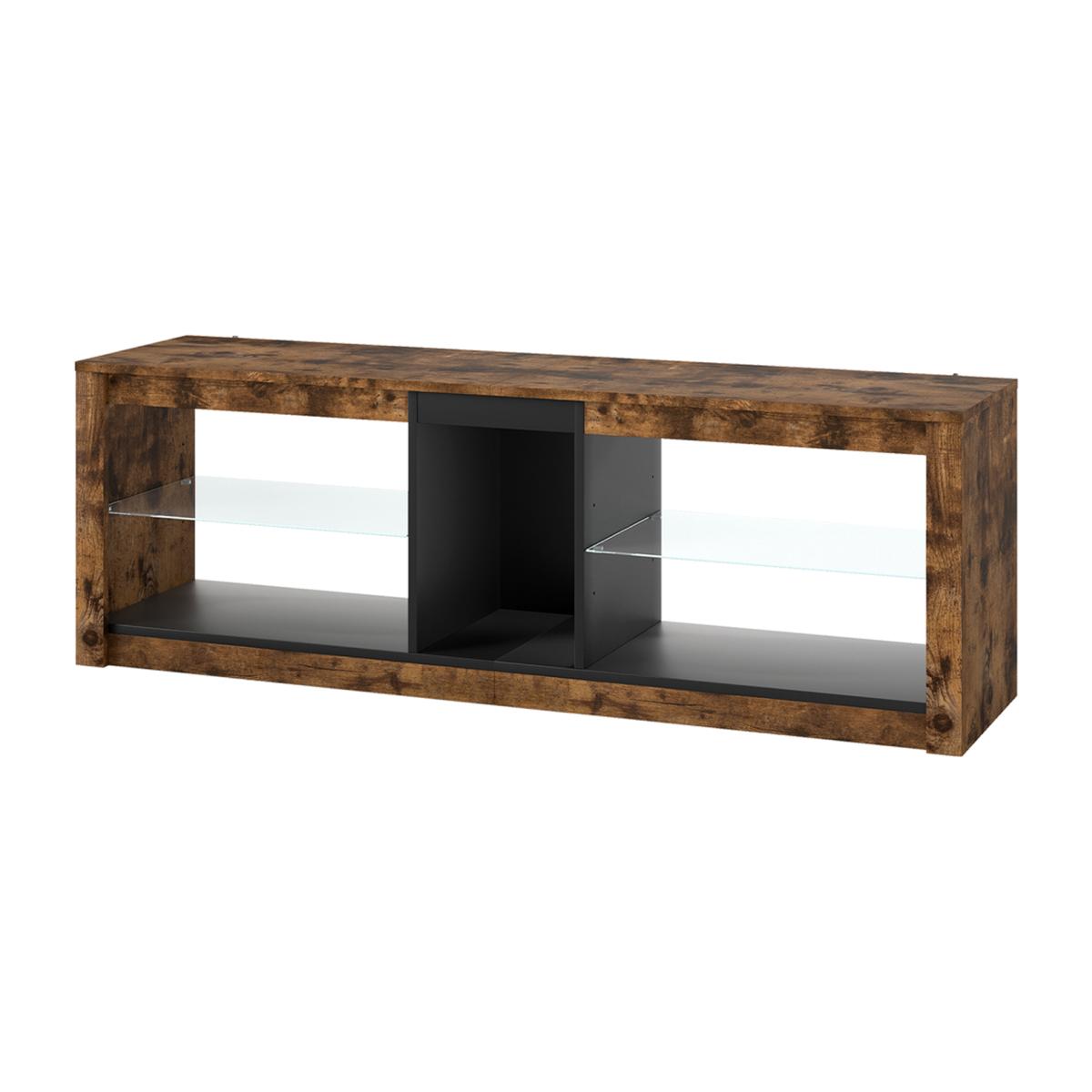 Upgrade your living room with this modern height-adjustable TV unit, combining style and practicality in one compact design. Measuring 140 x 35 x 47 cm, it provides ample space for flat screen TVs, gaming consoles, media players, and decorative items. Its slim yet sturdy construction makes it suitable for both small and large living areas. The unit features two open compartments with adjustable glass shelves, allowing flexible storage for consoles, DVD players, speakers, and decor. The integrated RGB LED lighting offers seven colour options and dynamic modes to create a customised ambience for movies, gaming, or relaxing evenings. A built-in anti-tip device ensures safety, making it suitable for homes with children or pets. Crafted from durable wood-effect panels and tempered glass, this freestanding cabinet supports up to 45kg on the top, 7kg per glass shelf, and 16kg at the bottom. Its minimalist design complements a wide range of interior styles, from contemporary to rustic. Delivered flat packed for easy assembly, it can be set up by one person in approximately 30 minutes. This versatile TV cabinet is ideal for anyone looking for a functional, stylish, and secure media storage solution. Its compact footprint, generous storage, and LED features make it perfect for modern living spaces where both aesthetics and practicality are important. Material P2 particle board, glass. Load capacity 45 kg (Top), 7 kg (Glass), 16 kg (Bottom)Open storage compartment dimensions 54.5 x 39 cm. Dimensions 140 x 35 x 47 cm