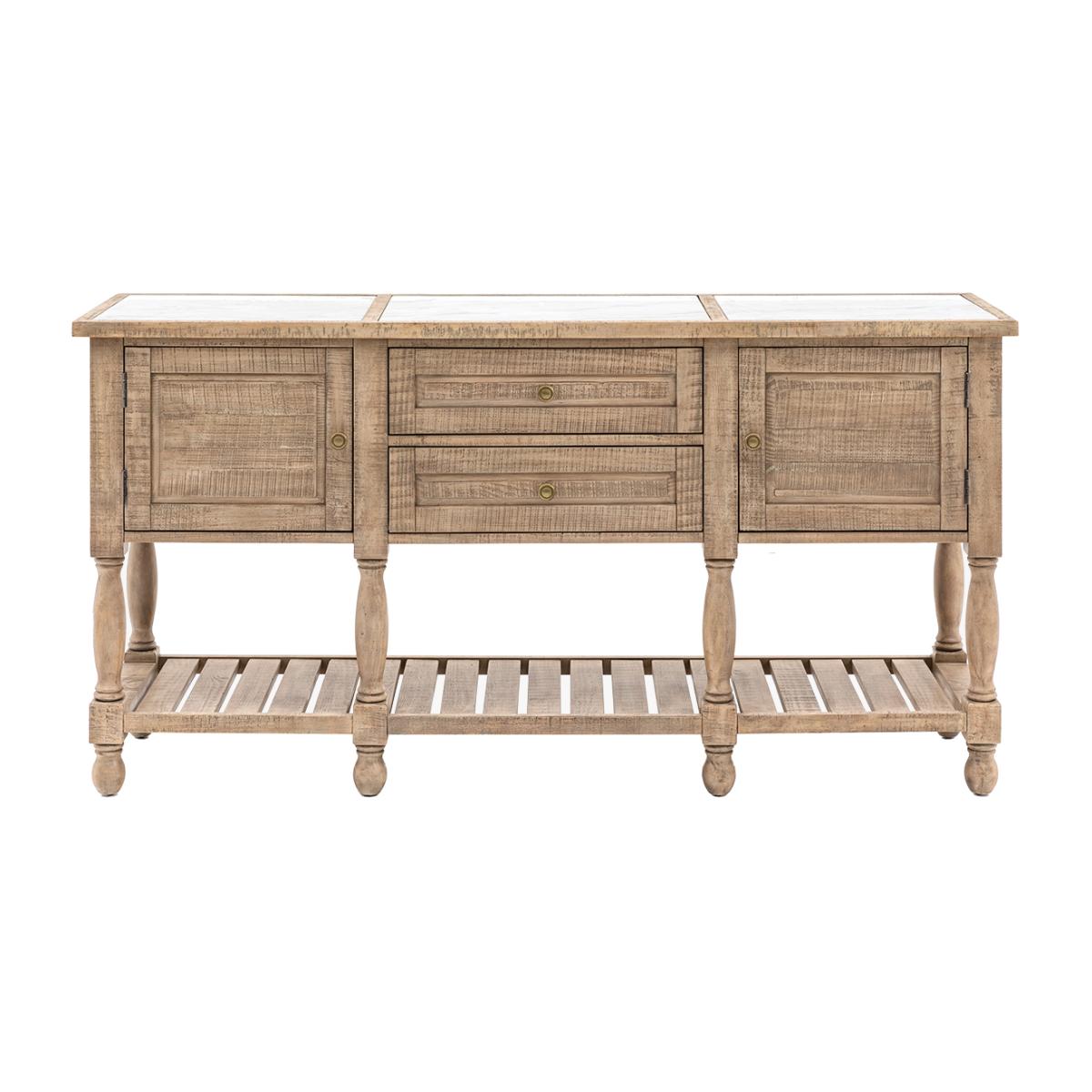 I’m a fan of this heirloom sideboard for its mix of weathered wood, rattan inlay and stone-effect top - it brings warmth and texture straightaway. It sits equally well in a relaxed coastal lounge, a modern farmhouse kitchen or an eclectic hallway, thanks to its neutral tones and practical two-door, two-drawer layout. For styling, keep it simple: a pair of ceramic vases either side of a low tray filled with coffee-table books, and a trailing plant to soften the linear shape. Tuck baskets on the lower shelf for concealed storage and swap artwork above to suit the season.