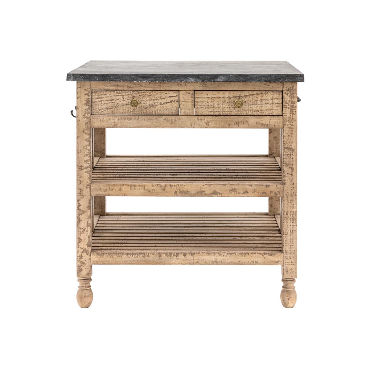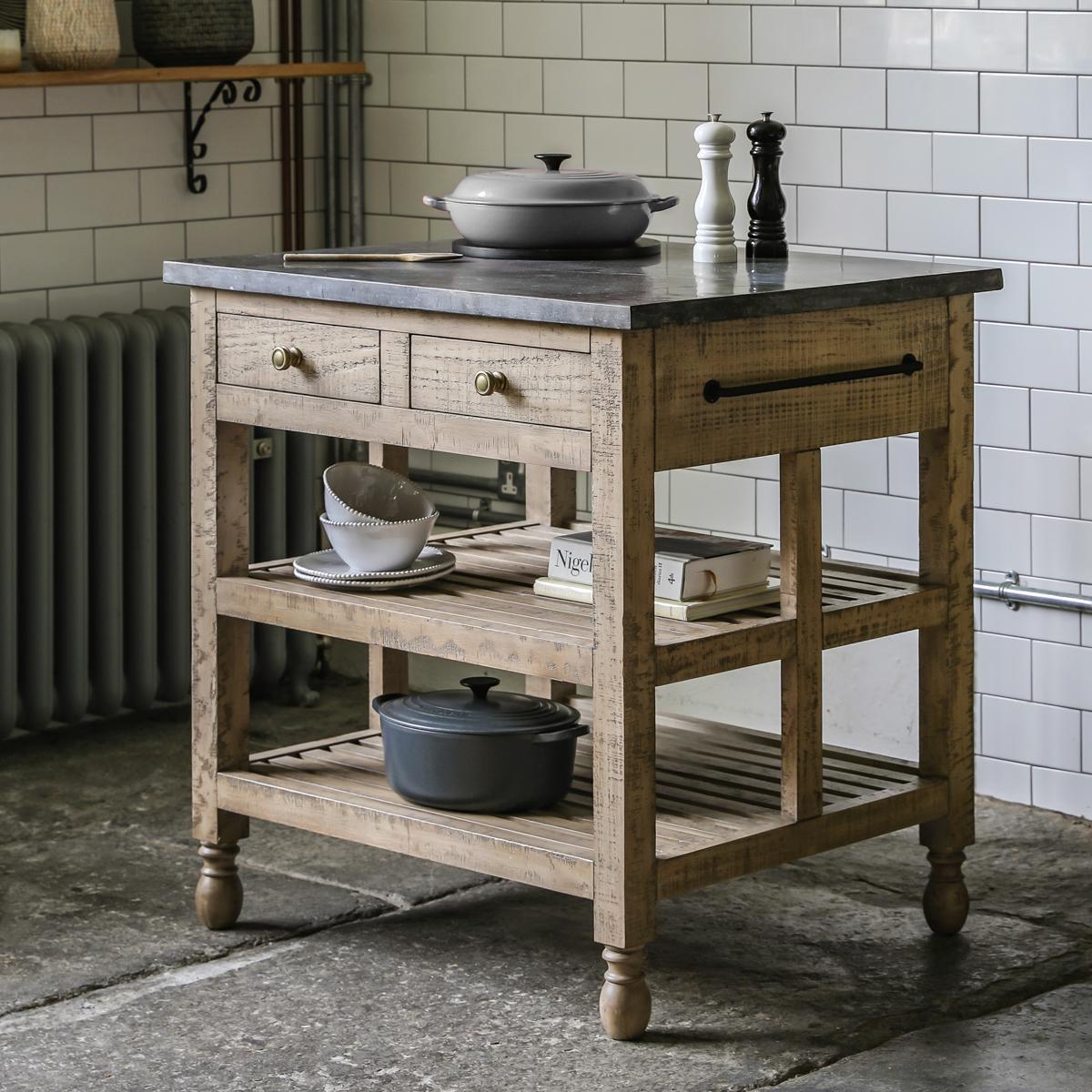I’m really taken with this petite kitchen island for its blend of weathered timber and cool stone top - it brings a lived-in character without feeling fussy. Its compact footprint and open shelving make it ideal for smaller kitchens, breakfast nooks or even as a handy coffee station in an open-plan living space. Styling tips - Use woven baskets on the lower shelves to keep everyday crockery or pantry bits tucked away yet accessible. - Group a pair of ceramic jugs or wooden boards on the top to add height and interest, then hang a set of teaspoons or linen tea towels from the side hook. - It works equally well in a country kitchen, a pared-back Scandinavian scheme or even a modern industrial space when paired with metal stools and a simple pendant light.