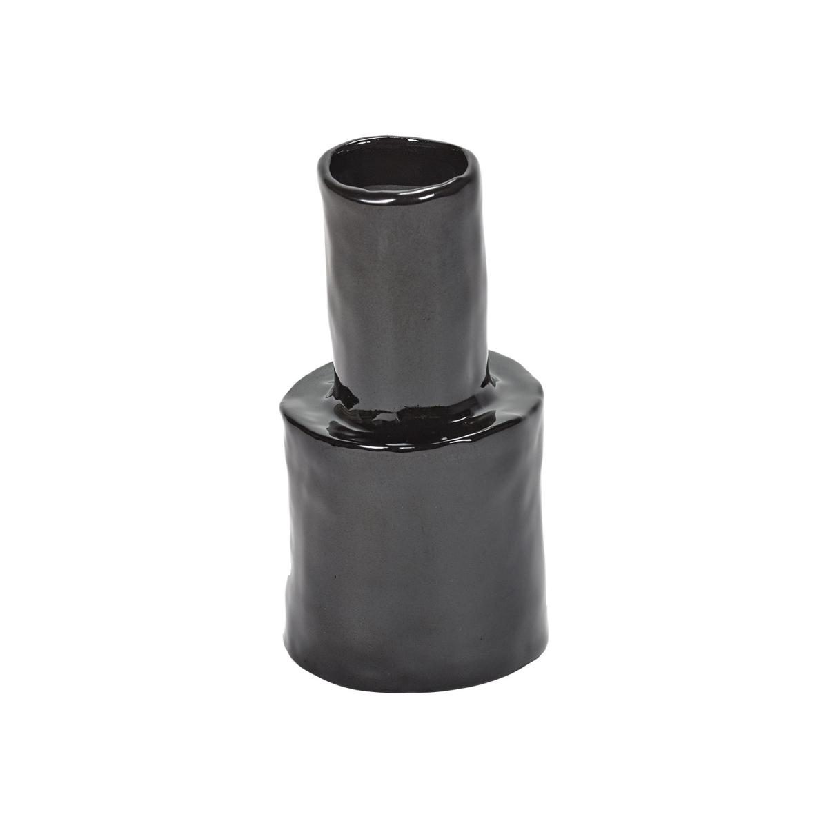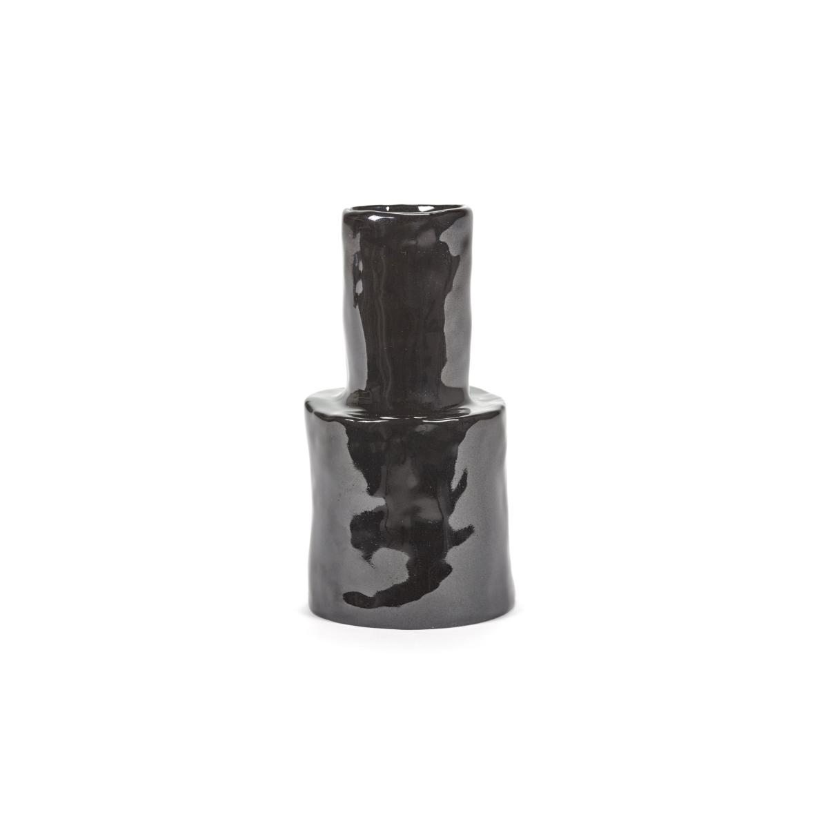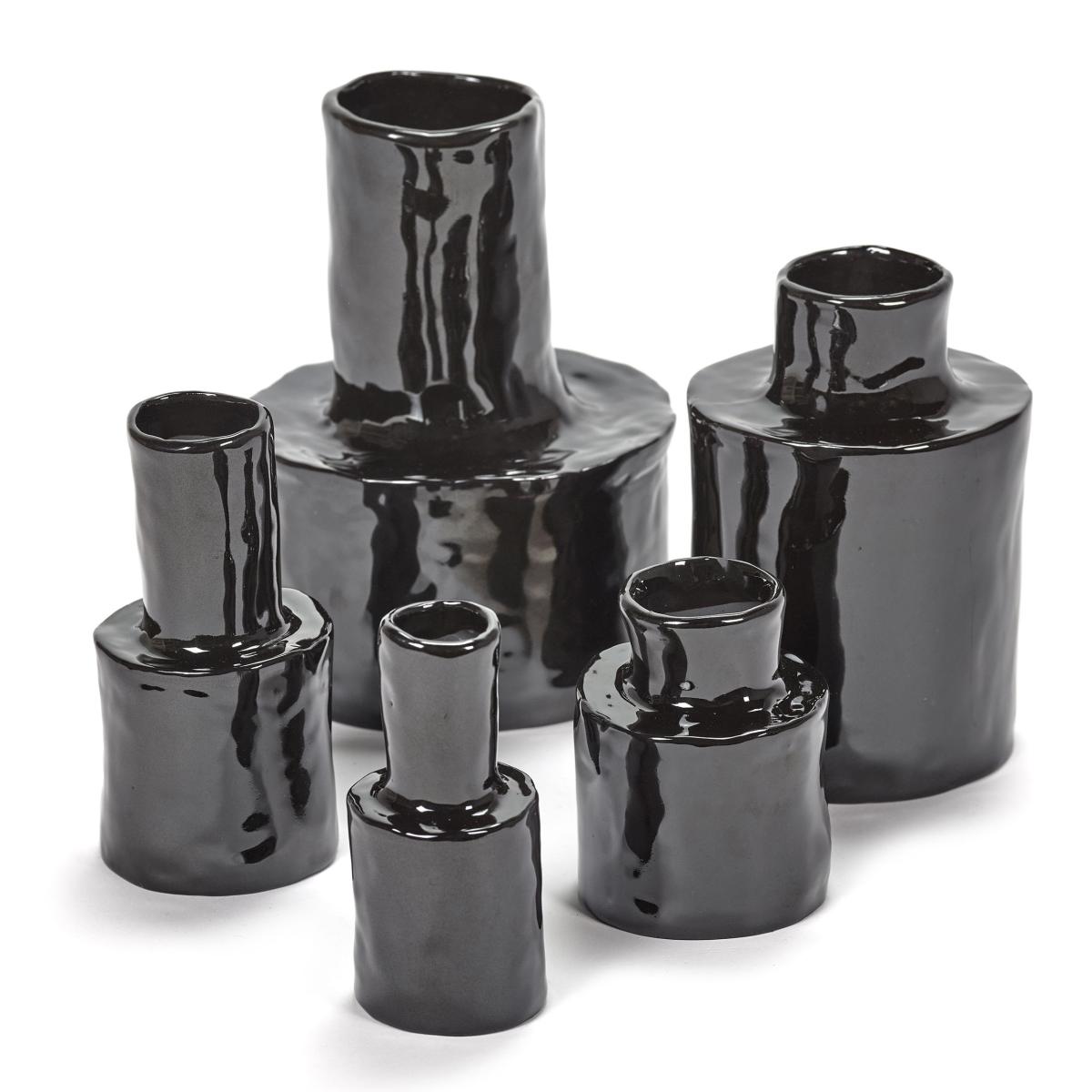 The five Héléna vases, in dark brown (almost black) sandstone, represent the first foray of Belgian artist Marie Michielssen into ceramics. Those who are familiar with Marie's work know that she likes to let her hands lead the process. On this topic, she's previously said that the repetitive nature of the actions use in modelling with plaster and papier-mâché meant that it was like meditating for her. The switch to ceramic thus wasn't a big change. The Héléna vases have simple, cylindrical shapes, where the irregular shape of hand-modelling are clearly marked. Marie Michielssen has a preference for materials that she can mould by hand. She allows herself to be guided by her intuition, to give shape to items with an atypical and poetic look. The designer never starts by throwing down ideas on paper. No technical drawings or 3D models on the computer: she prefers to let the material express itself during the creative process by shaping it by hand. "During the modelling process, I often play with primary shapes like cylinders, spheres and squares. I bring them together to create new shapes. It's all very intuitive."