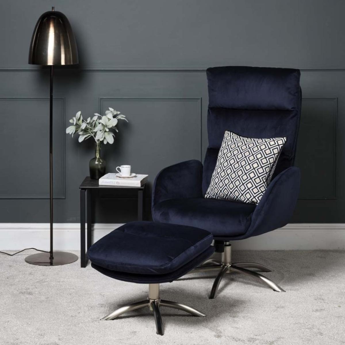 Put your feet up and relax with the Helena recliner chair and footstool. After a long day there is no better feeling that sitting back and relaxing and the Helena chair and footstool is the perfect way to do just that. With a high padded back, there is plenty of support and the wide arms add even more comfort. Adjust the chair to suit your desired comfort, put your feet up on the padded footstool and relax. This chair is available in three velvet colours Mustard, Grey and Blue. *Footstool included *Velvet Upholstery *Brushed chrome base and brushed chrome legs on stool *Adjustable recline function *Simple Self Assembly *W:68cm D:85cm H:110cm
