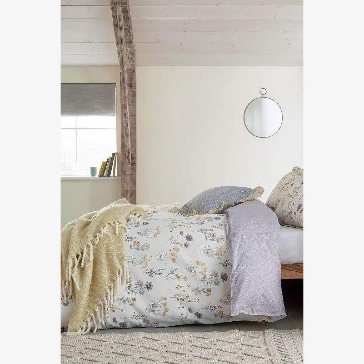 A beautiful botanical study of flowers and foliage is arranged in a repeating pattern across this 100 BCI cotton bedding. Captured in a palette of soft watercolour tones, the yellow colourway reverses to a small spotty print in lilac. Available in a choice of four sizes which include pillowcases - one with the single and two with the double, king and superking. Fable39;s sophisticated range of high-quality and high-thread count bed linens help turn a bedroom into a personal sanctuary with a trademark use of understated pattern, a gently muted colour palette and subtle detailing. An elegant collection that has timeless appeal with exquisite attention to detail, the well-considered accent accessories- from cosy cushions to tactile throws, help tailor-make a look with small luxury touches that bring designer style to life.. *Reversible *Button fastening *Tumble dry Safe *Iron on low heat *Machine washable *100 BCI Cotton * Pillowcase: 74cm x 48cm All screens vary in colour reproduction and whilst every effort has been made to display the colour as accurately as possible it is for guidance only.