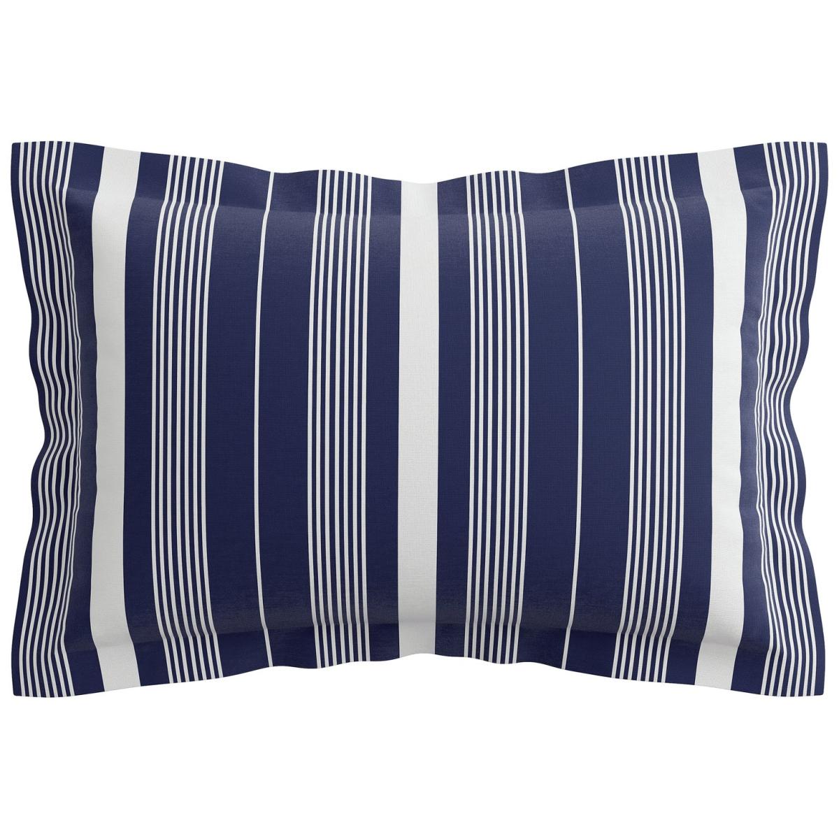 This bold, vertical stripe celebrates all things nautical; inherently chic the characteristic navy and white colourway evokes memories of sandy coves and bays, salty air and fresh summer breezes. The reverse print is a smart geometric pattern. Accessorise with warm layers that offer the perfect embrace. Finish: woven. 100% cotton. Set includes 1 duvet cover and 2 pillowcases. Bed size: double. Length 200cm, Width 200cm. Buttons for fastening. Oxford pillowcase (s). Machine washable. Suitable for tumble drying.