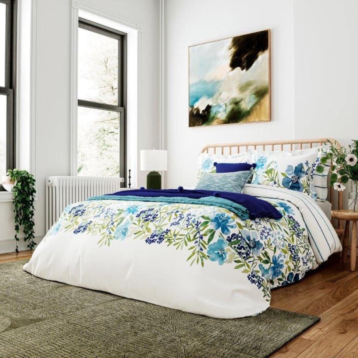 Beautiful watercolour florals are entwined in a panel and set against a fresh white cotton background.  A delicious combination of blue and green tones creates a naturally beautiful scheme.  Available in four sizes of duvet cover set, the cotton is responsibly sourced from the Better Cotton Initiative. All screens vary in colour reproduction and whilst every effort has been made to display the colour as accurately as possible it is for guidance only Duvet Cover With Matching Oxford Pillowcase(s). Single Duvet Cover:140 x 200cm, Double Duvet Cover:200 x 200cm, King Duvet Cover: 230 x 220cm, Super King Duvet Cover 260 x 220cm. 100 Cotton Machine Washable. Tumble Dry on Low Heat. Please note, the cushion and the throw pictured are not included in this purchase.
