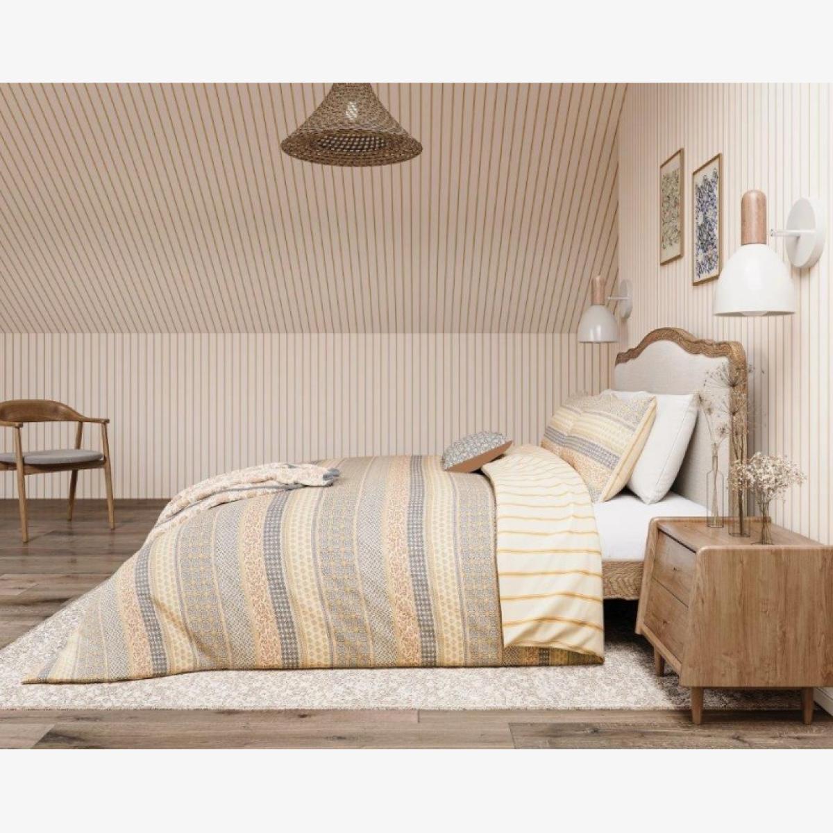 The Folk Stripe Duvet Set by Helena Springfield introduces a striking yet elegant touch to your bedroom. Featuring an all-over horizontal stripe design with alternating bands of intricate geometric and floral detailing, this set blends contemporary style with a folk-inspired charm. The sophisticated graphite and copper colourway adds warmth and depth, while the reverse and matching pillowcases feature a simple vertical stripe for a fresh, versatile contrast. Crafted from 100% cotton, this duvet set promises natural softness and comfort. Features: Horizontal stripe design with geometric and floral detailing Graphite and copper colourway for a modern, elegant look Reversible design with a vertical stripe reverse and matching pillowcases 100% cotton for softness and breathability Single Duvet Includes Single Pillowcase Double, King and Superking Size Duvet Includes Pair of Pillowcases Care Instructions: Machine washable Wash dark and light colours separately Tumble dry on a low heat setting Iron on reverse if required The Helena Springfield Folk Stripe Duvet Set combines detailed design with comfort, making it a stylish and cosy addition to your bedroom. Please note All screens vary in colour reproduction and whilst every effort has been made to display the colour as accurately as possible it is for guidance only.