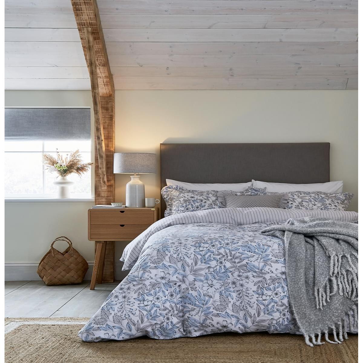 Kemble takes its inspiration from nature and features a graphic country floral print in classic blue and neutral hues. Printed on 100% BCI cotton and available in four sizes of duvet cover set, the reverse is a smart ticking stripe in coordinating tones. Add the warm embrace of the Tenby tasselled throw and complete the bed with the Ness cushion. Fable's sophisticated range of high-quality and high-thread count bed linens help turn a bedroom into a personal sanctuary with a trademark use of understated pattern, a gently muted colour palette and subtle detailing. An elegant collection that has timeless appeal with exquisite attention to detail, the well-considered accent accessories- from cosy cushions to tactile throws, help tailor-make a look with small luxury touches that bring designer style to life. Reversible Button fastening Tumble dry Iron on low heat Machine washable 100% BCI Cotton Pillowcase: 74 x 48cm Pillowcases included All screens vary in colour reproduction and whilst every effort has been made to display the colour as accurately as possible it is for guidance only.