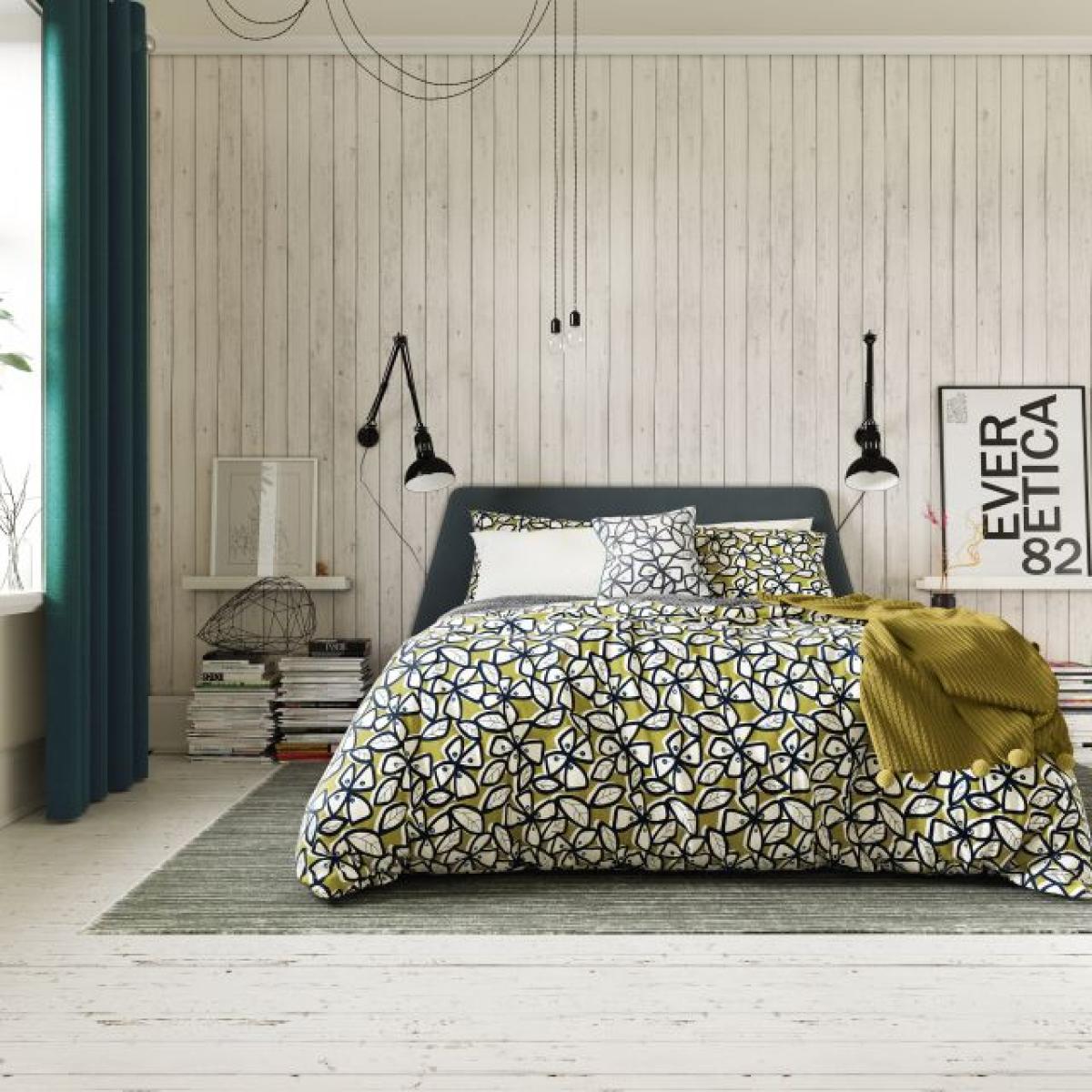 A signature Scandi floral design with a contemporary linear look. The all over design sits on a chartreuse green base with inky blue detailing. The reverse showcases an edgy small scale all over angular pattern. Bring the story together with the matching fitted sheet and standard pillowcase. The contrasting breakfast cushion with navy embroidered detailing and highlights of chartreuse and teal bring the perfect finishing touch. Polyester 52%/Cotton 48% Single Duvet Includes Single Pillowcase Double, King and Superking Size Duvet Includes Pair of Pillowcases All screens vary in colour reproduction and whilst every effort has been made to display the colour as accurately as possible it is for guidance only.