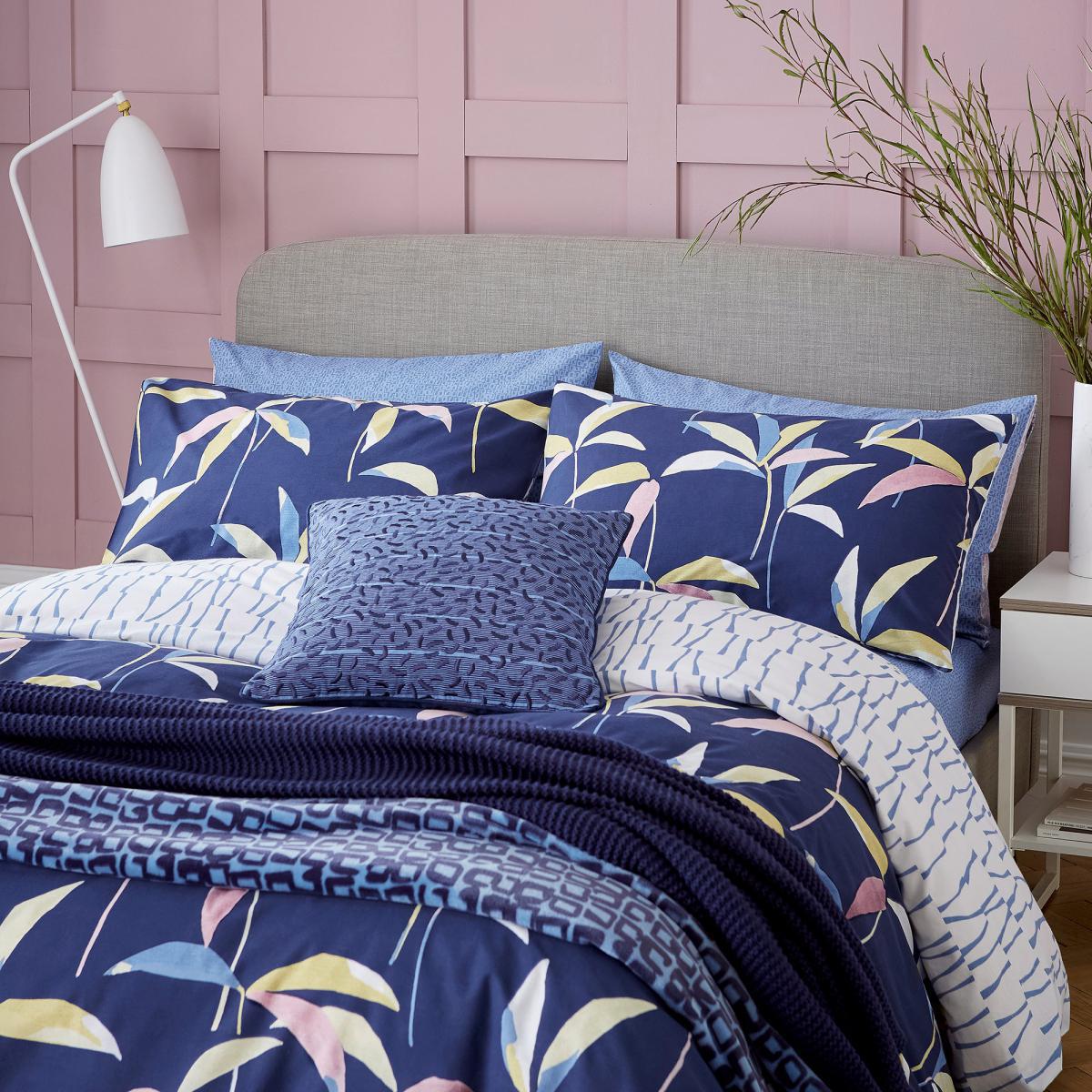 A lively design with a tropical feel. The large-scale hand-painted bamboo leaves feature all over in navy, blush, and soft green with a calmer linear cane design on the reverse. Team with the coordinating curtains to enliven your window or add further interest with the navy hues from the coordinating accessories. The super-soft fleece throw with painterly style rectangular grid design or add tactility with the rib knit throw in navy with large chunky twisted tassels. The sweet breakfast cushion with confetti effect paint marks and embroidered detailing is the perfect finishing touch. Care Instructions:.