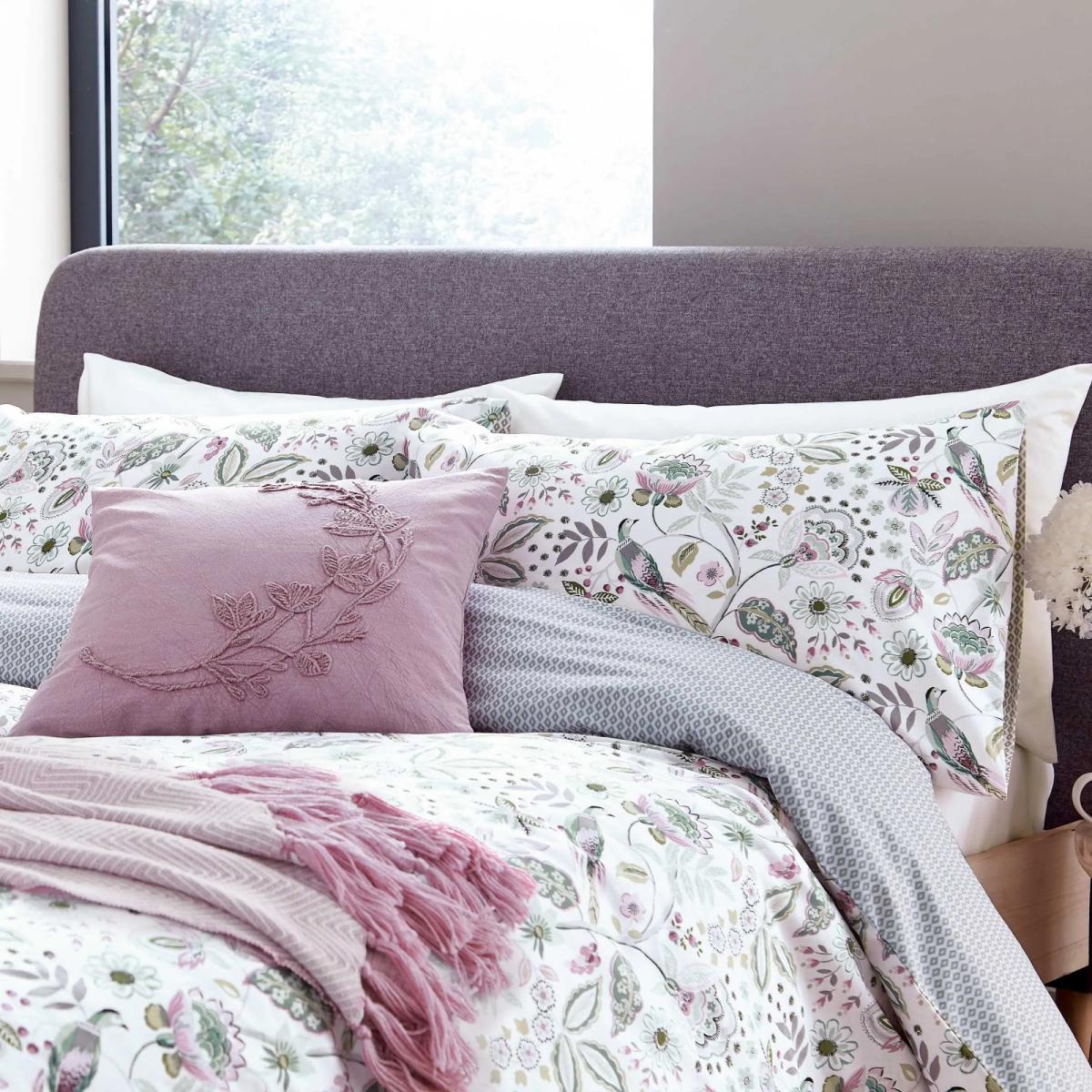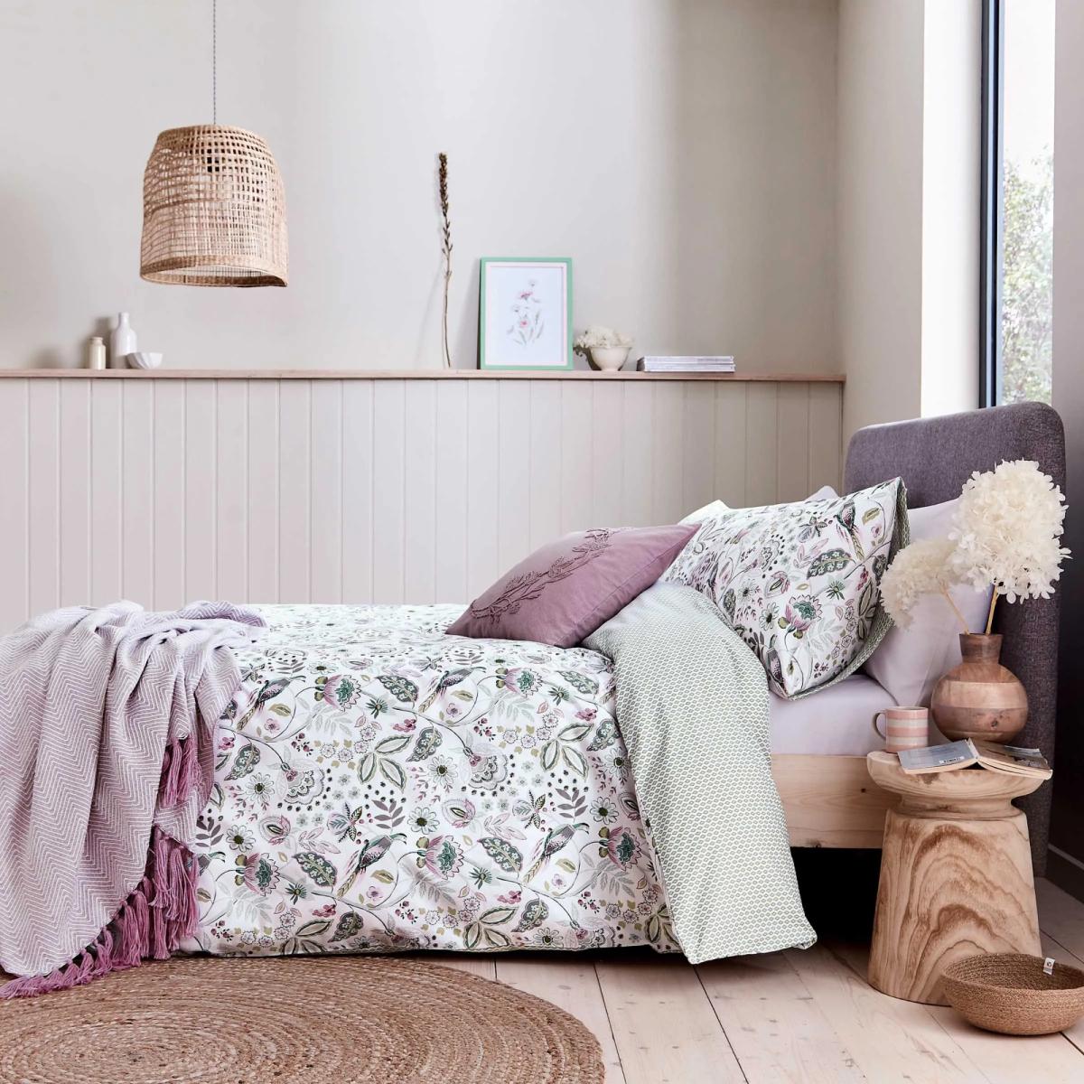 Add a touch of elegance to your bedroom with the Helena Springfield Zara Cover Set in sage green and lilac. The bird trail pattern on the front evokes a sense of tranquility and nature, creating a peaceful and serene atmosphere. The reverse features a small-scale diamond pattern, offering a modern geometric touch that complements the natural design. 50% Cotton, 50% Polyester. Machine Washable. Tumble Dry on Low Heat. Single Duvet Includes Single Pillowcase Double, King and Superking Size Duvet Includes Pair of Pillowcases Dimensions Single :140 x 200cm, Double :200 x 200cm, King : 230 x 220cm, Super King 260 x 220cm. Oxford Pillowcase: 74cm x 48cm + 5cm Please Note: All screens vary in colour reproduction and whilst every effort has been made to display the colour as accurately as possible it is for guidance only. Throw and cushion are not included and are for illustrative puposes only.