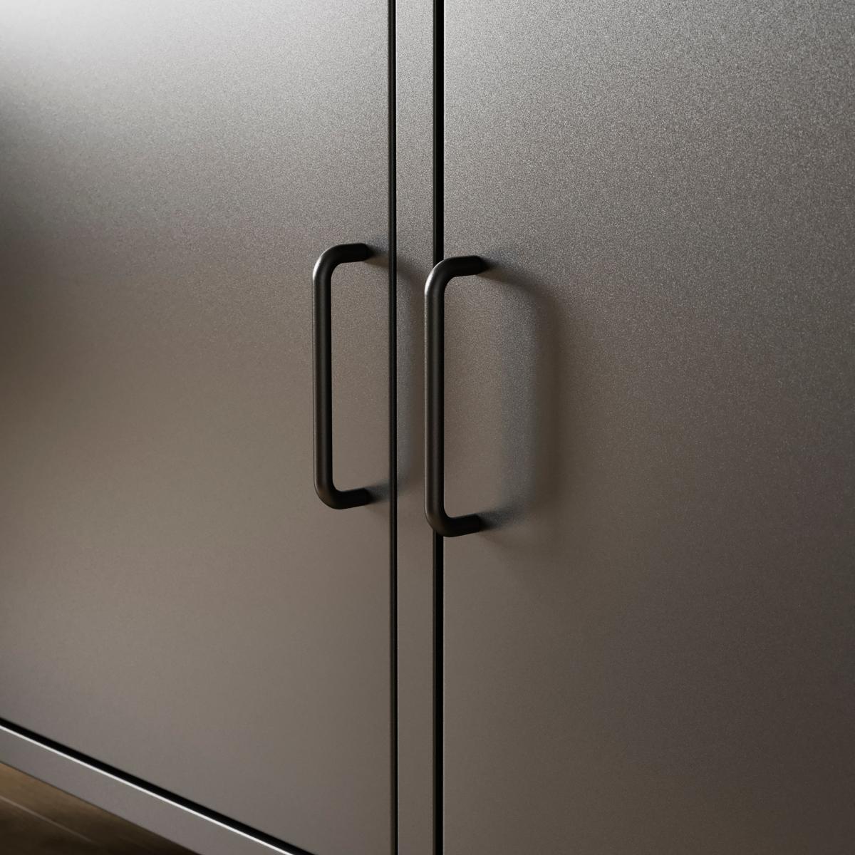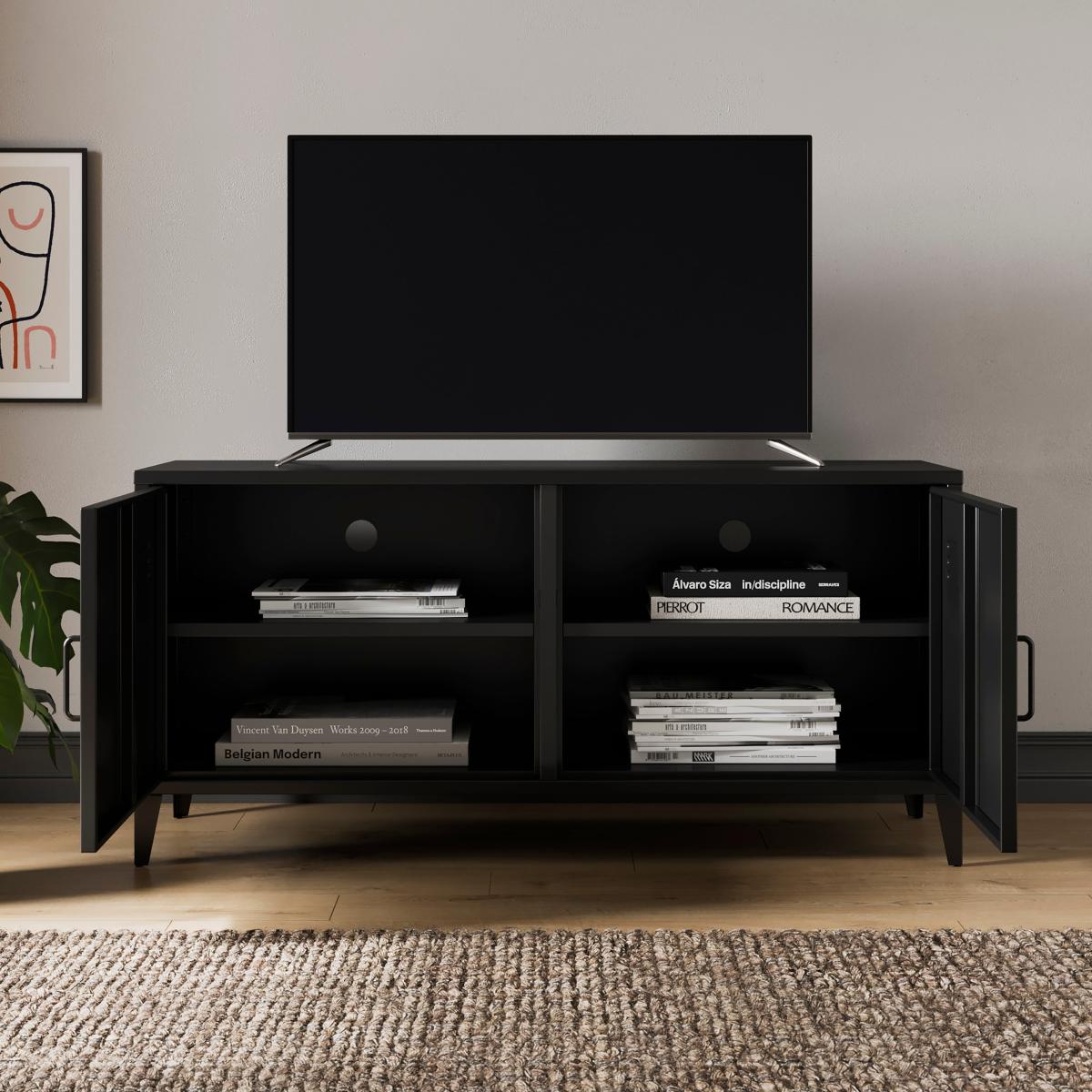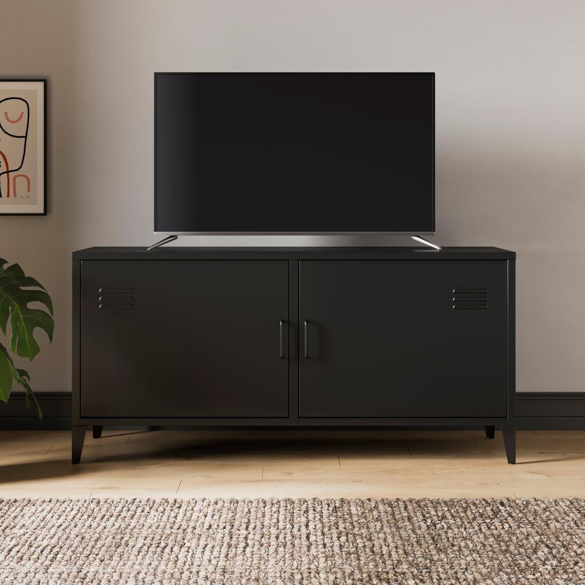 * Locker Style* Easy Assembly This sideboard seamlessly merges industrial aesthetics with modern functionality, creating a striking focal point for your entertainment area. Crafted with a robust metal frame, its clean lines and sleek design exude a contemporary charm. The metal finish not only adds an industrial edge but also ensures durability for long-term use. The sideboard provides a sturdy platform for your television, while the open shelving below offers ample space for media devices and decor items. Please note, that if using as a TV Stand, to use your devices the doors must be kept open.