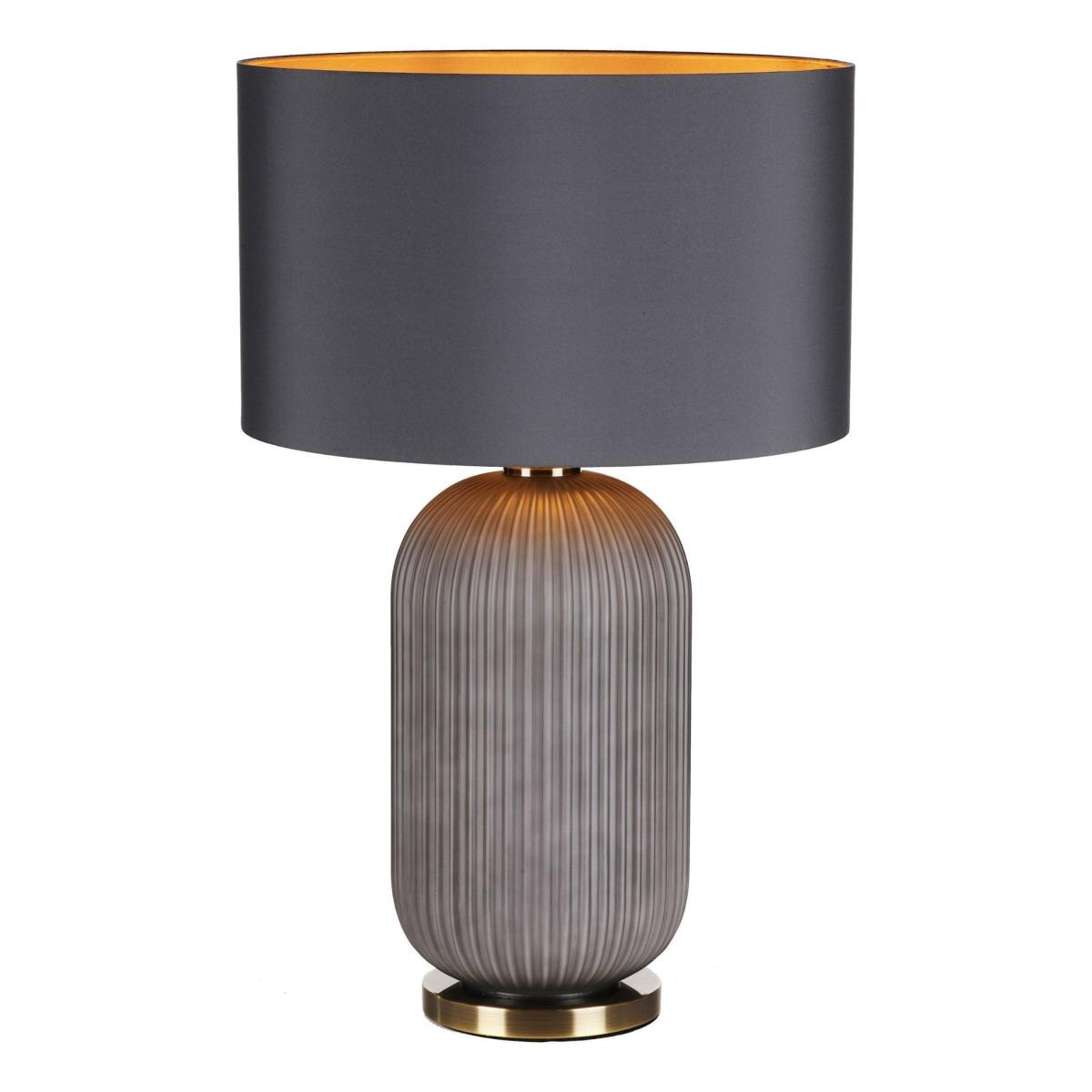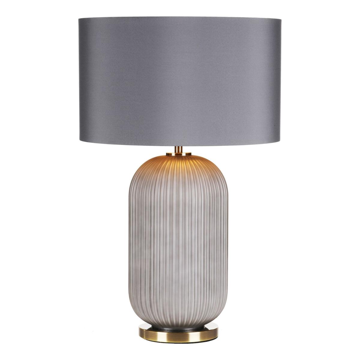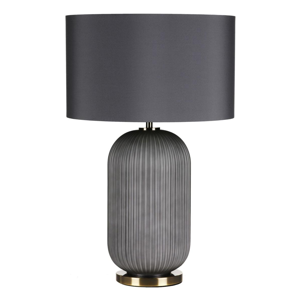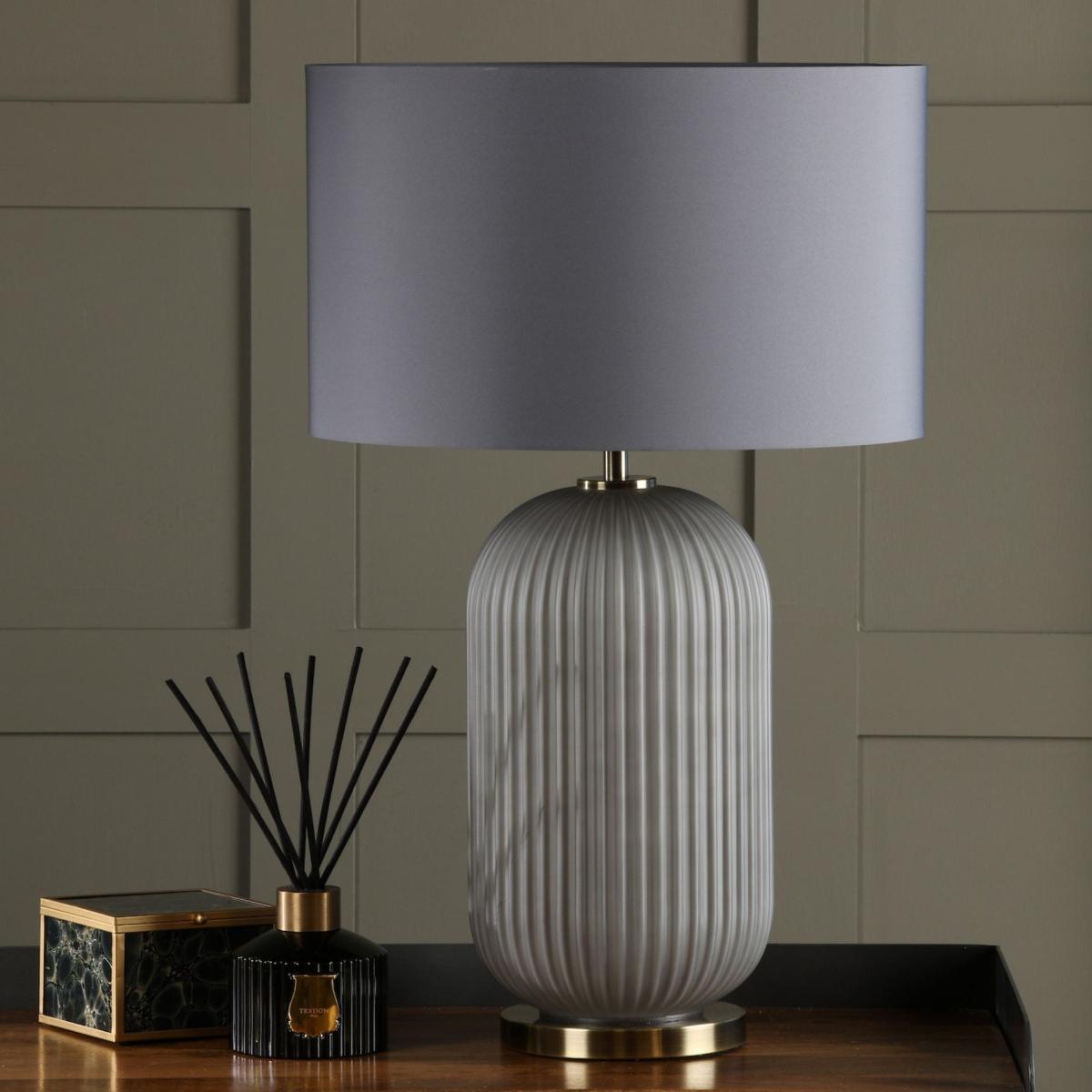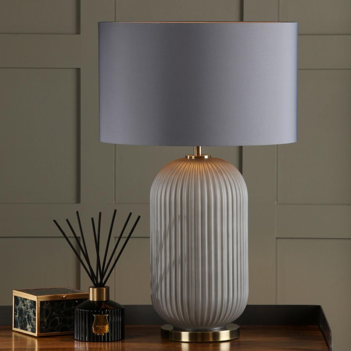 Helicon 1-light table lamp, featuring a ribbed glass, lozenge-shaped base in a soft grey colour, paired with a grey drum shade with self-coloured lining and complemented by antique brass fittings.   Helicon 1-light table lamp, featuring a ribbed glass, lozenge-shaped base in a soft grey colour, paired with a grey drum shade with self-coloured lining and complemented by antique brass fittings.