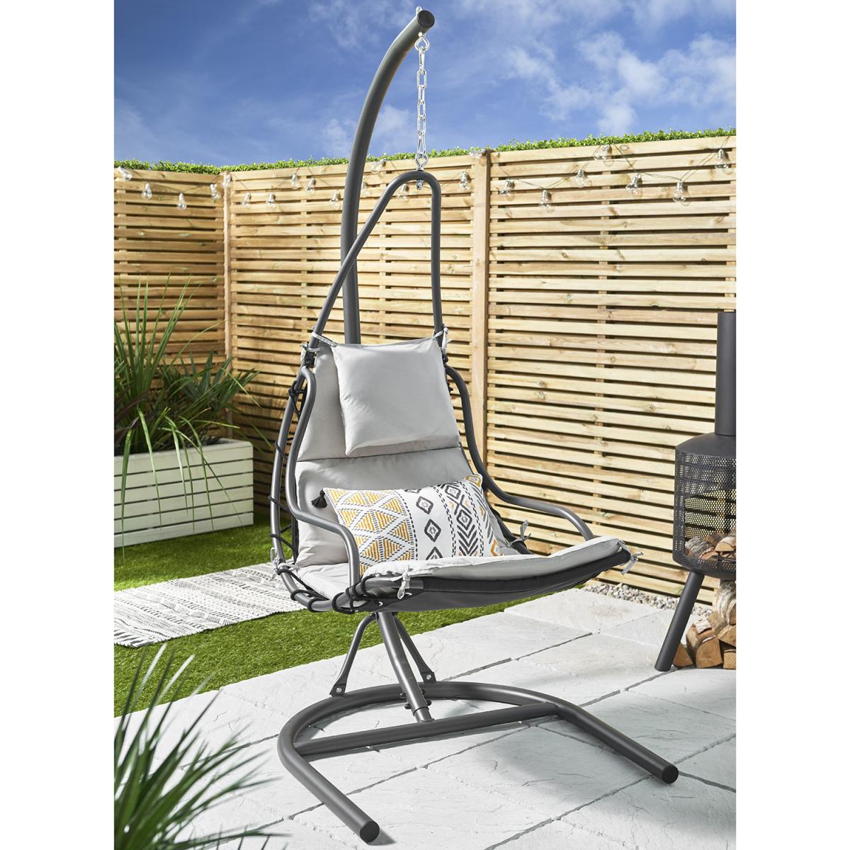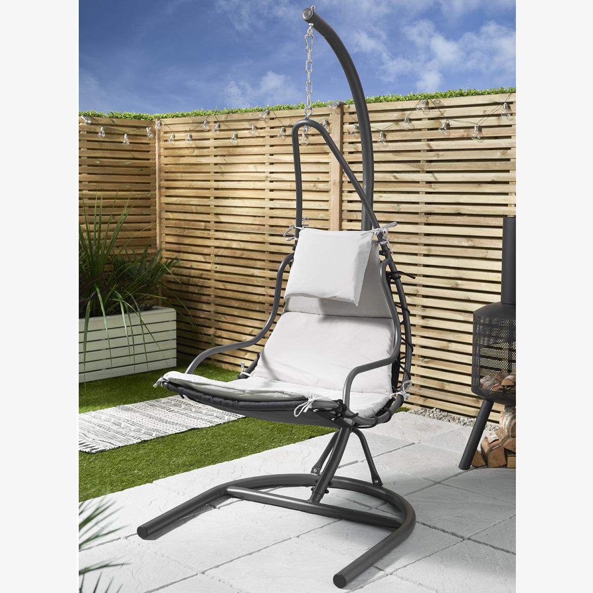With its fun and unique design, the Helicopter Hanging Chair will soon become a firm favourite piece of patio furniture. The egg chair hangs from a tall, sturdy frame, connected by a chain which will bring a soothing swinging motion as you sit back and relax with a good book in the sun. Comfortable cushions, with extra padding in the head cushion, adds a high level of comfort, making the Helicopter Hanging Chair a perfect place to curl up and relax in the sun. The frame of the Helicopter Hanging Chair is made from powder coated steel, and this paired with the U-shape of the feet creates a sturdy and durable frame that will easily keep the chair secure. The frame is coloured a flat black, which contrasts nicely with the white cushions, bringing an air of sleek sophistication that will make your relaxation time feel luxurious.
