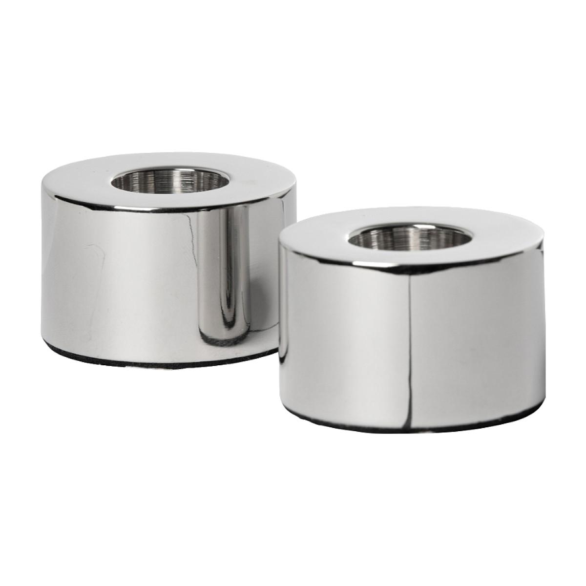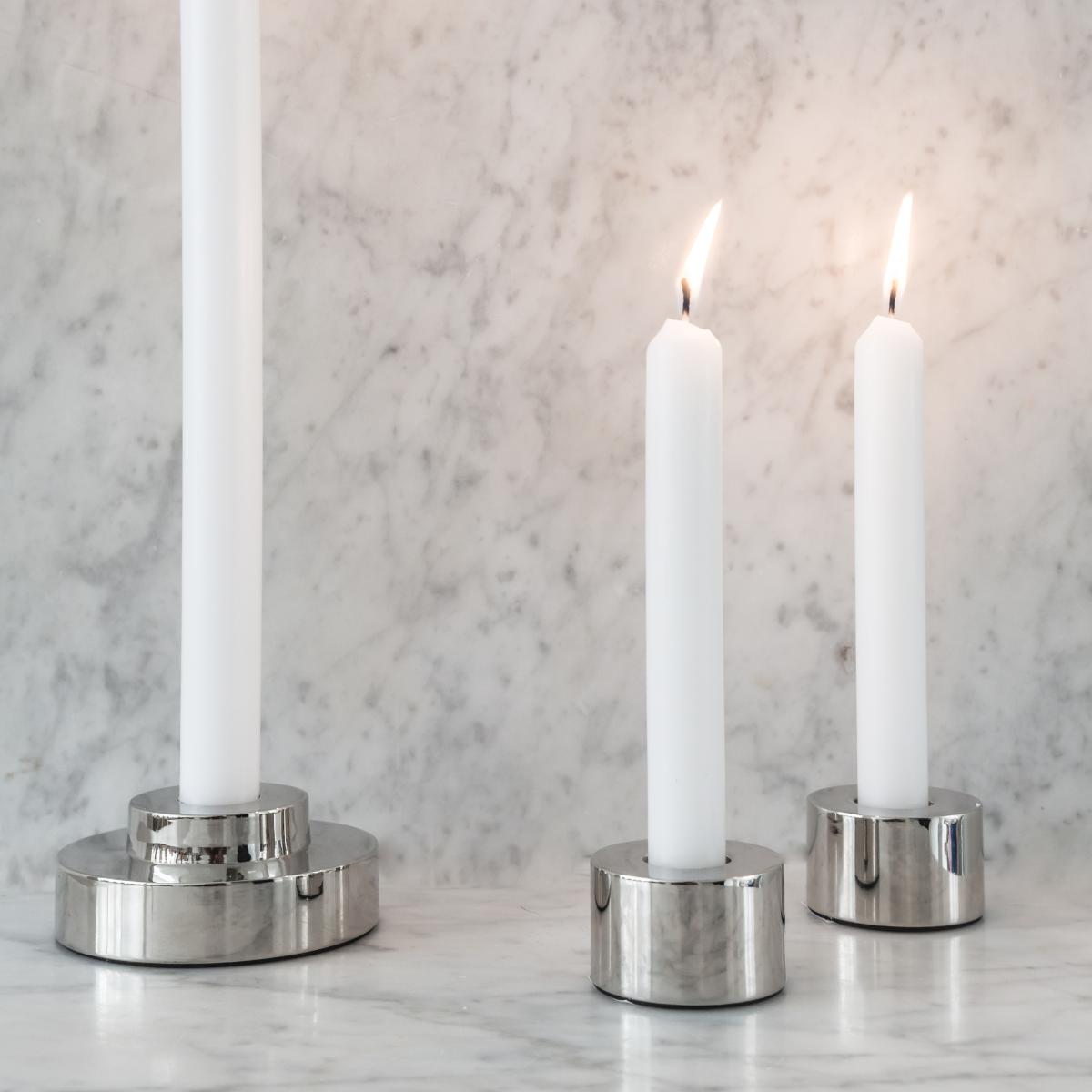 These candlesticks are a sleek, modern addition that work particularly well in Minimalist or Scandinavian-inspired interiors. Their smooth chrome finish adds a touch of sophistication and reflects light beautifully, making them perfect as a centrepiece or accents on a sideboard or dining table. For styling tips, try pairing them with tapered candles in neutral shades for understated elegance, or go bold with coloured or patterned candles to add a bit of contrast. They also work well in multiples for a balanced, curated look or solo as a subtle statement piece. Their simple, polished design ensures they blend seamlessly into both contemporary and more traditional settings, making them versatile for various interiors.
