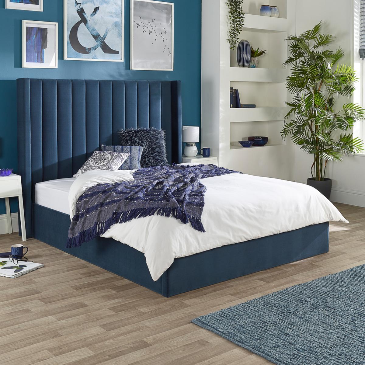 A luxurious, quality ottoman bed frame with a large, padded headboard to form a stunning focal point to any bedroom. Upholstered in a soft touch brushed velvet in navy blue. The bed features high quality sprung slats enhancing mattress comfort and lifespan. The large storage area can be easily accessed with the help of the included gas lift pistons, once the bed is open the mechanism will hold in place allowing hands free access to the large storage area. The storage area features a fabric dust protector so stored items are not in direct contact with the floor.