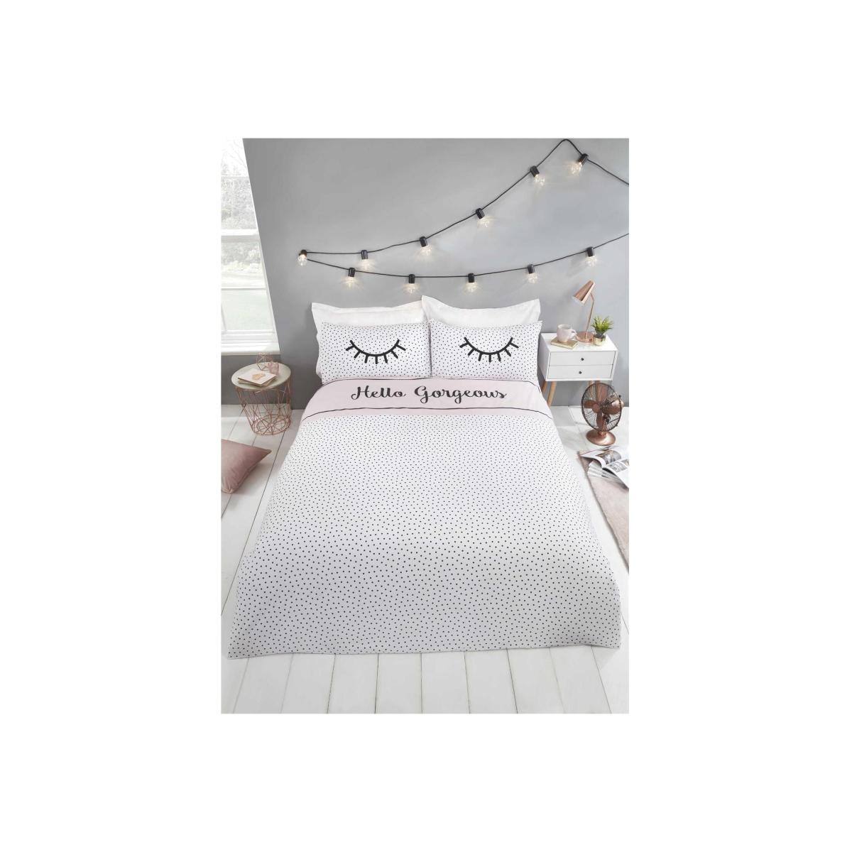 Add a touch of character to your bedroom with these simple yet unique duvet cover sets. Featuring a simple black and white polka dot design finished with a blush panel containing the words 'Hello Gorgeous' and an eyelash on each pillowcase, with a plain blush reverse, these duvet cover sets are more than your ordinary sets giving you two great designs for the price of one.