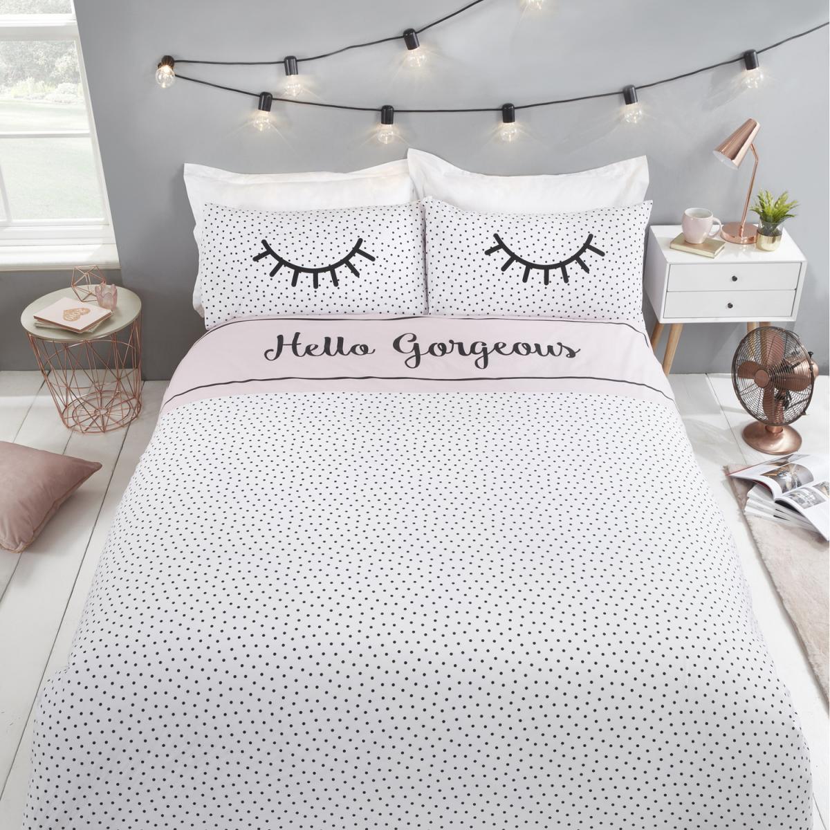 Fun and quirky eyelash polka dot print design duvet cover set.