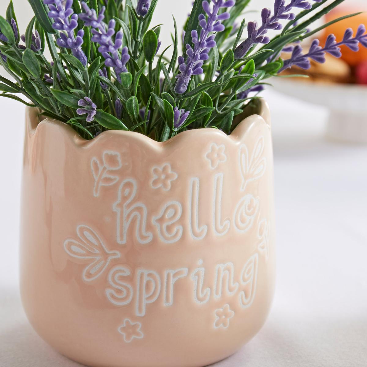 * Soft pink glaze * Scalloped edge detail * 'Hello Spring' white typography design * Floral details * Indoor use Give your favourite mini plant a new home with this 'Hello Spring' ceramic plant pot. With a diameter of 10cm and a glazed floral design, along with a petal shaped scalloped edge detail, this little pot will make a lovely display for your Spring decor. Its mini size is ideal for real or artificial plants alike and it is perfect for placing on a shelf or mantelpiece.
