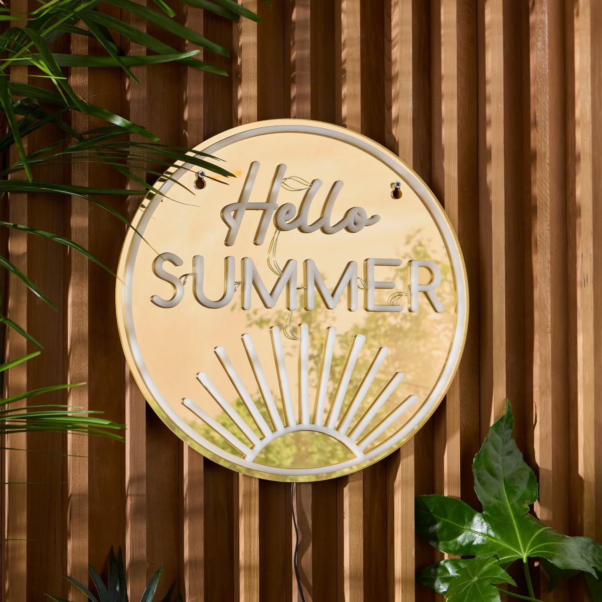 * "Hello Summer" Motif * Beautiful, Eye-Catching Look & Design * Easy to Hang - Simple Installation * Convenient Waterproof Plug * Indoor & Outdoor Suitable Bring summer vibes to your outdoor space with this eye-catching neon sign, which features a soft LED strip and a gorgeous orange glow to create a stylish ambience. Easy to hang, this light comes supplied with a long 1.8m cable and a handy waterproof plug.