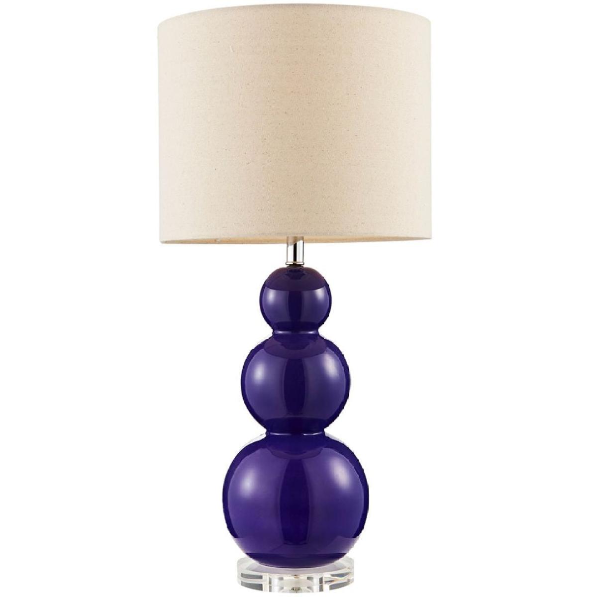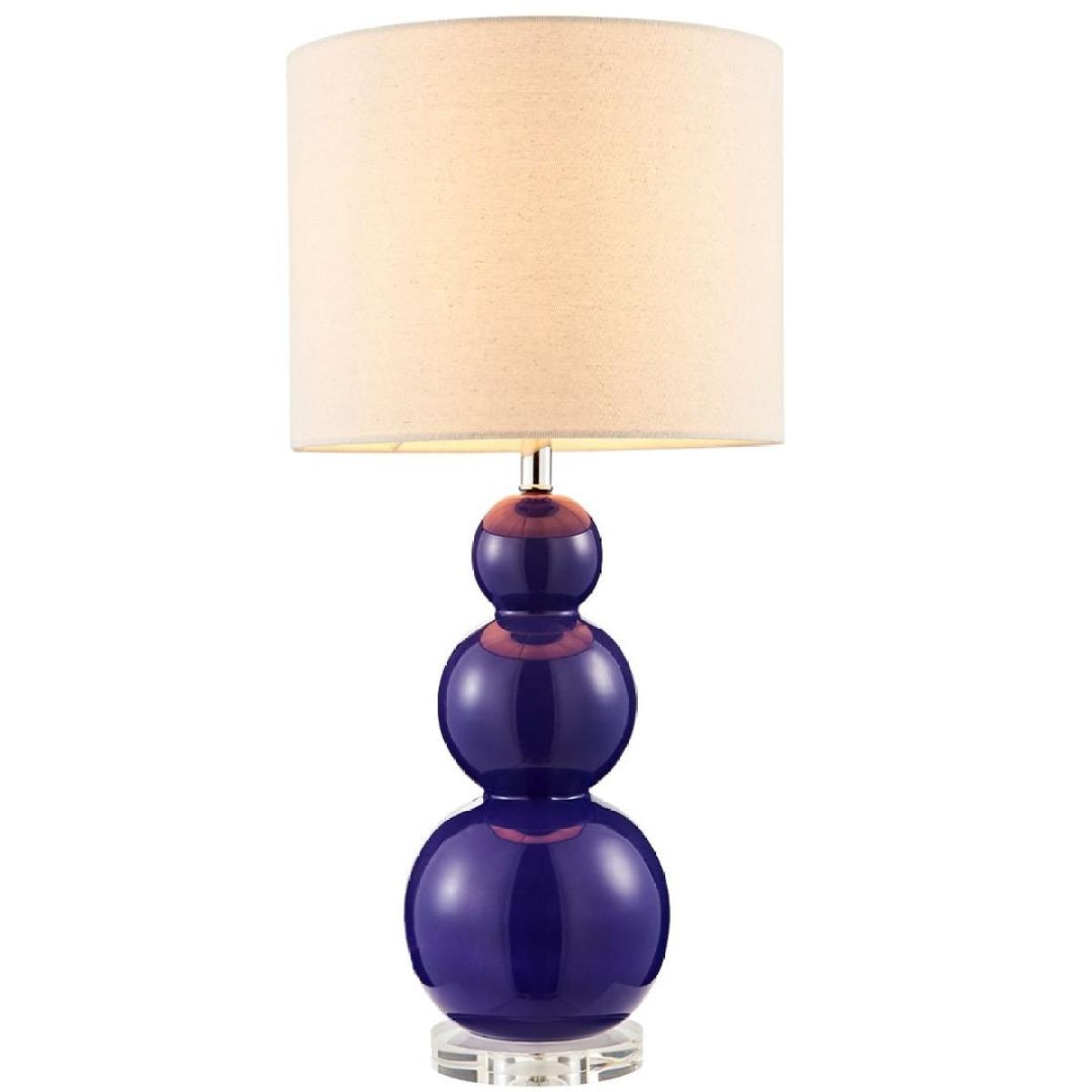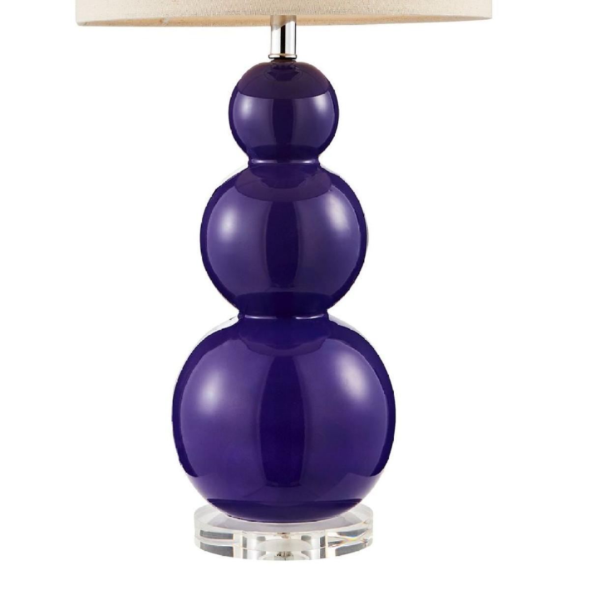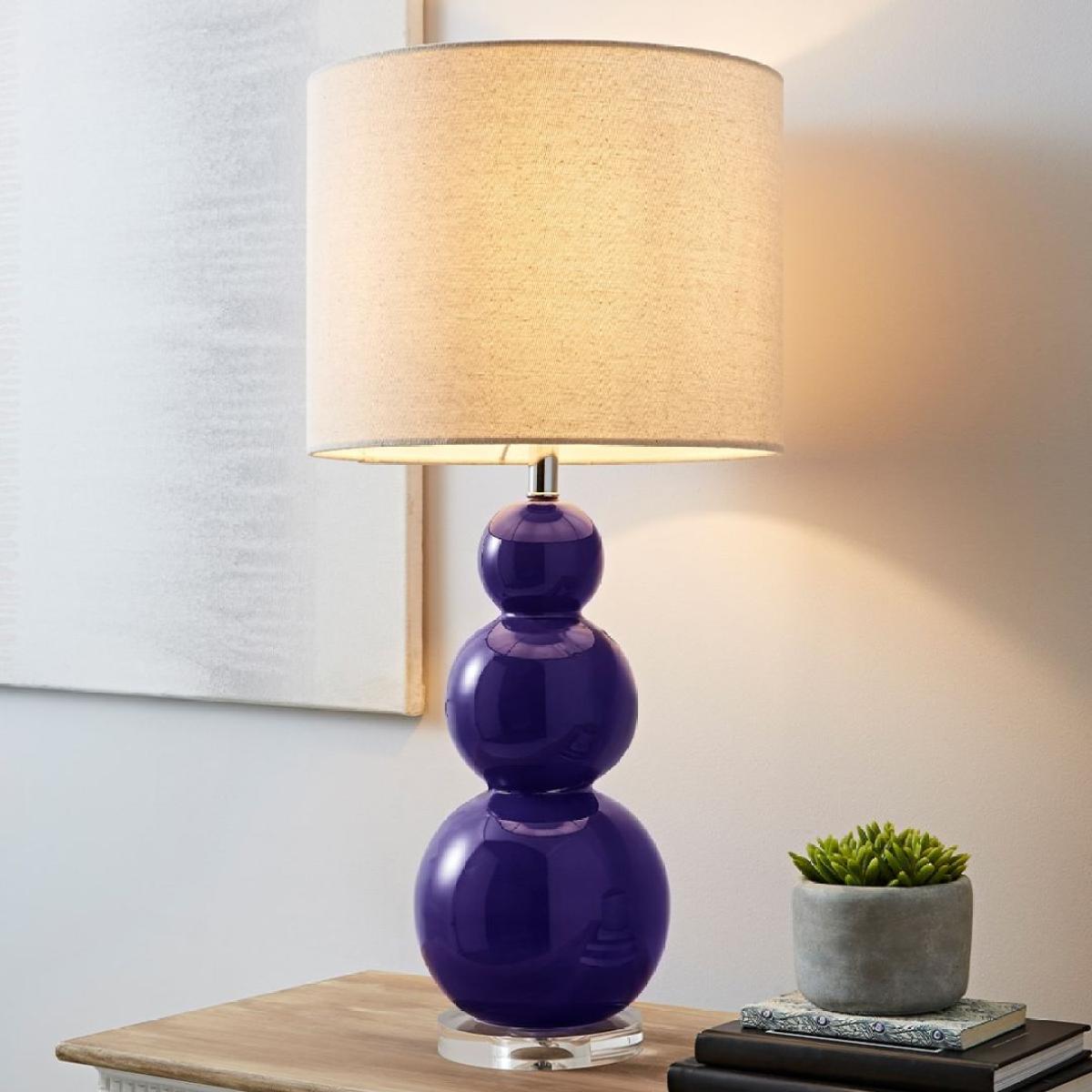 Contemporary table lamp featuring a purple glass base Unique in design, the Helly table lamp features a purple glass base and circular cream shade. Add a quirky touch to any lounge, hallway or bedroom. Contemporary table lamp featuring a purple glass base Unique in design, the Helly table lamp features a purple glass base and circular cream shade. Add a quirky touch to any lounge, hallway or bedroom.