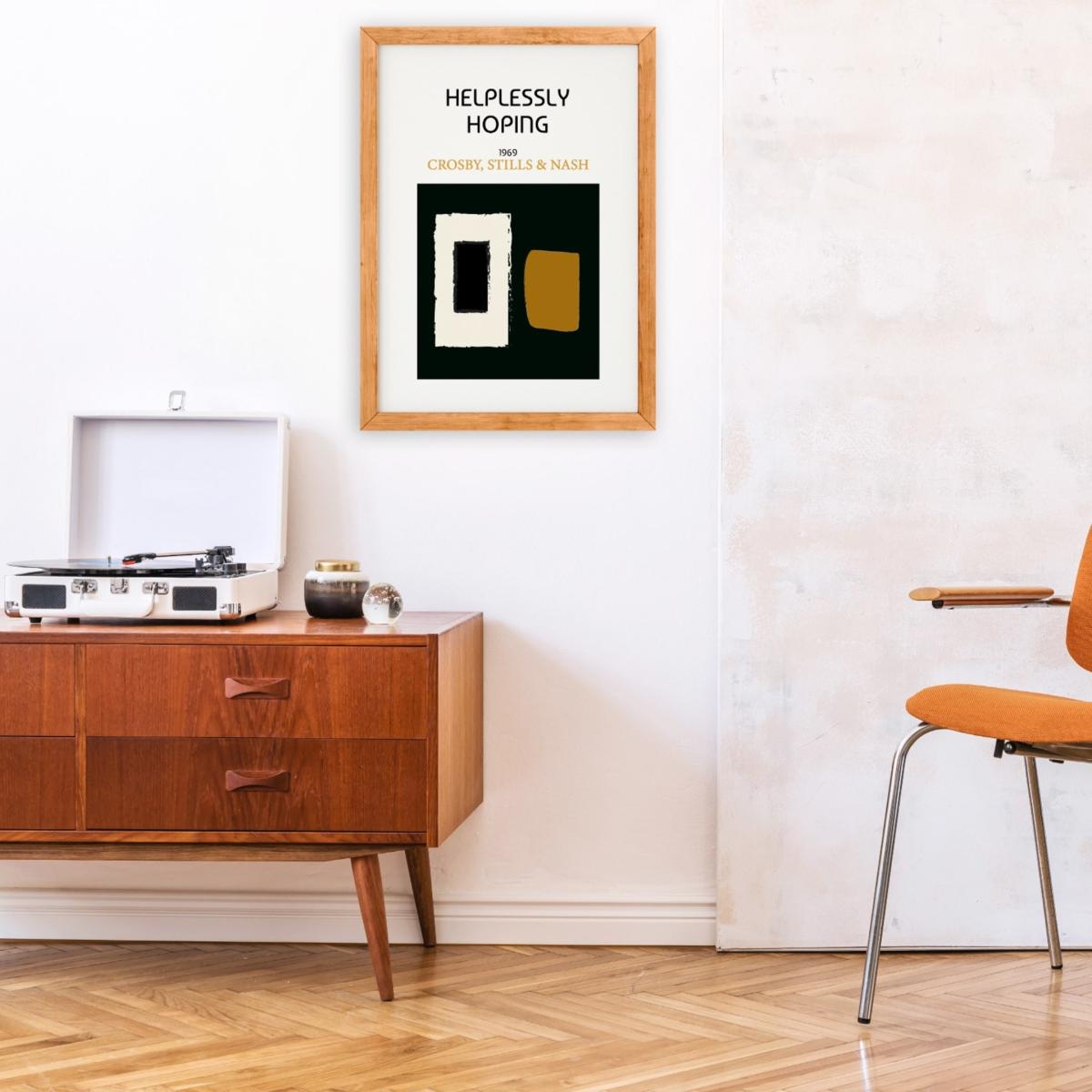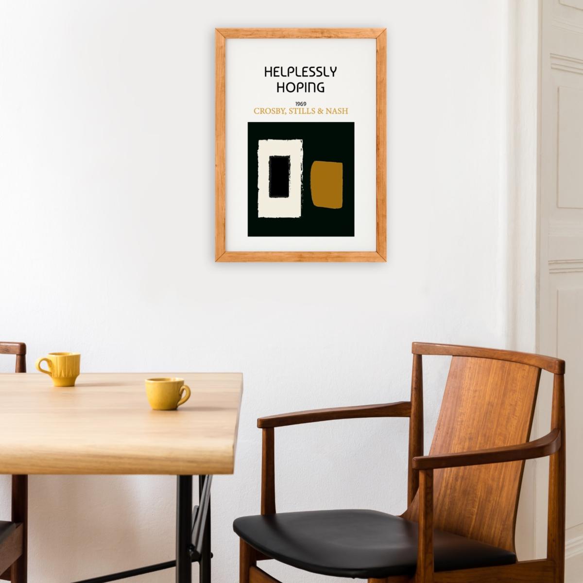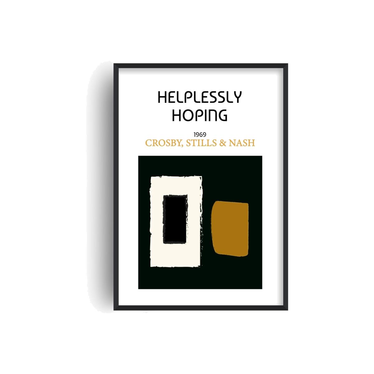 Helplessly hoping art print inspired by the current state of the world, it's hard to gain control of any future, but we still have our hope. Influenced by the iconic 70s hit by Crosby, Stills and Nash, a gentle reminder to not give up. Inspired by early 60s abstract art, a muted colour palette and a strong statement reflecting how we feel, the perfect sidekick to your vinyl player and mid century decor. Giclée printed on Munken pure smooth cream paper which is certified by the Rainforest Alliance Program for FSC® Standards.