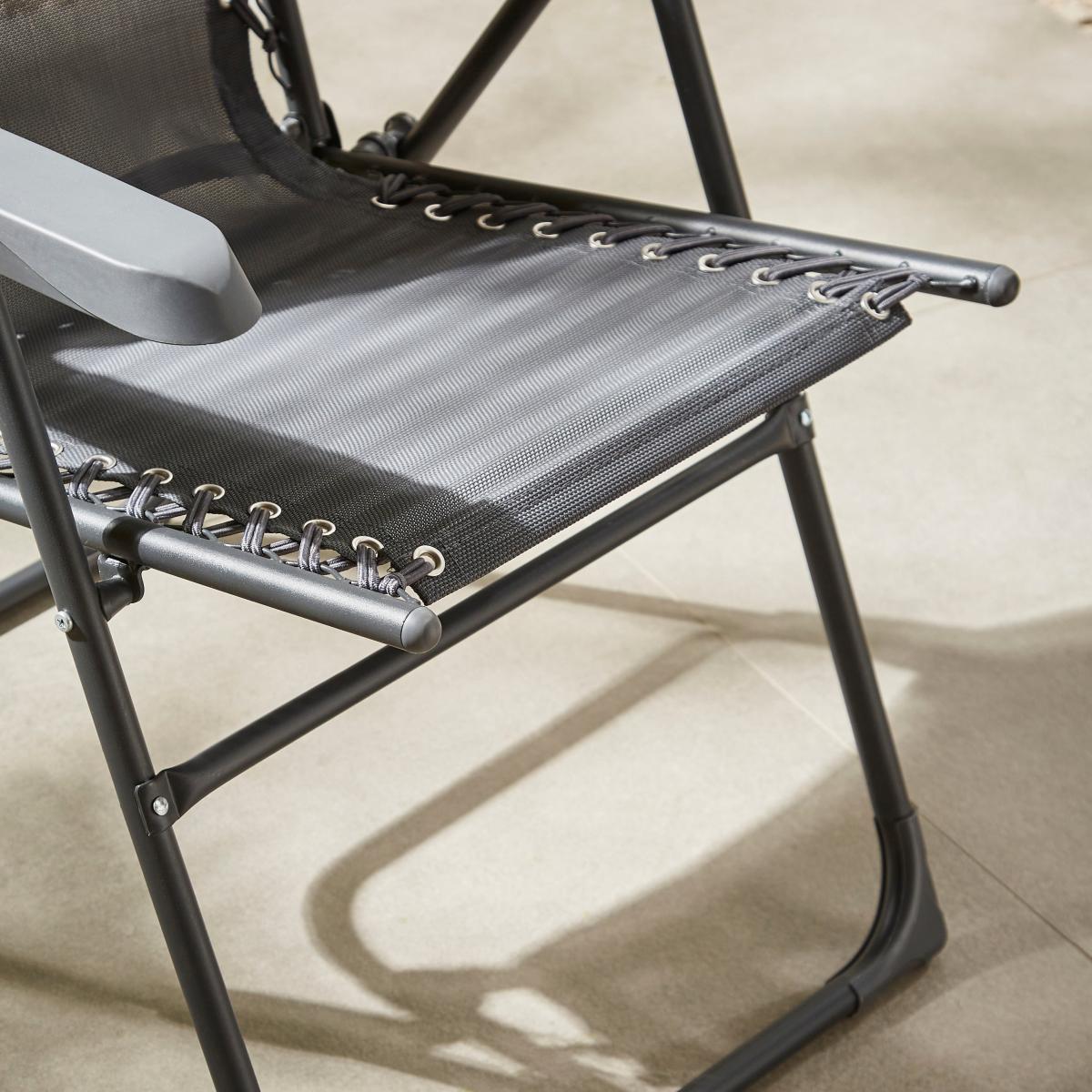 * Straight back * Folding design * Back reclines * Chic charcoal grey * Simply wipe clean This folding Helsinki garden chair is sure to be a hit when relaxing in your outdoor space. The back has a headrest and also reclines, with multiple adjustable positions for your convenience. The chic charcoal grey colourway will complement a range of garden decor themes, bringing effortless style, and is simply wiped clean to keep it looking its best. When it's time to store it away, it folds down for easy, space saving stowing.