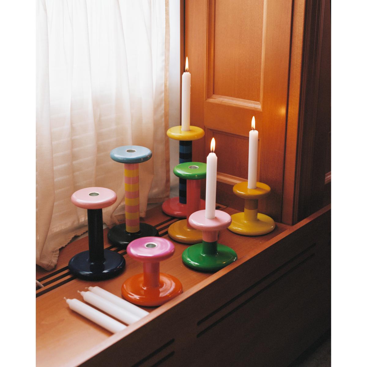 Pesa candlestick Low 11 cm from Hem is a hand-painted candlestick designed by Fabien Cappello that captures the eye with its glossy stripes and full, inflated form. Made from solid beech, it offers tactile warmth and a unique surface where each piece becomes one of a kind. The dumbbell-shaped silhouette makes it easy to move and position alone, in pairs or in groups for a graphic effect on a side table, windowsill or dining table. A decorative and playful detail that elevates the home.