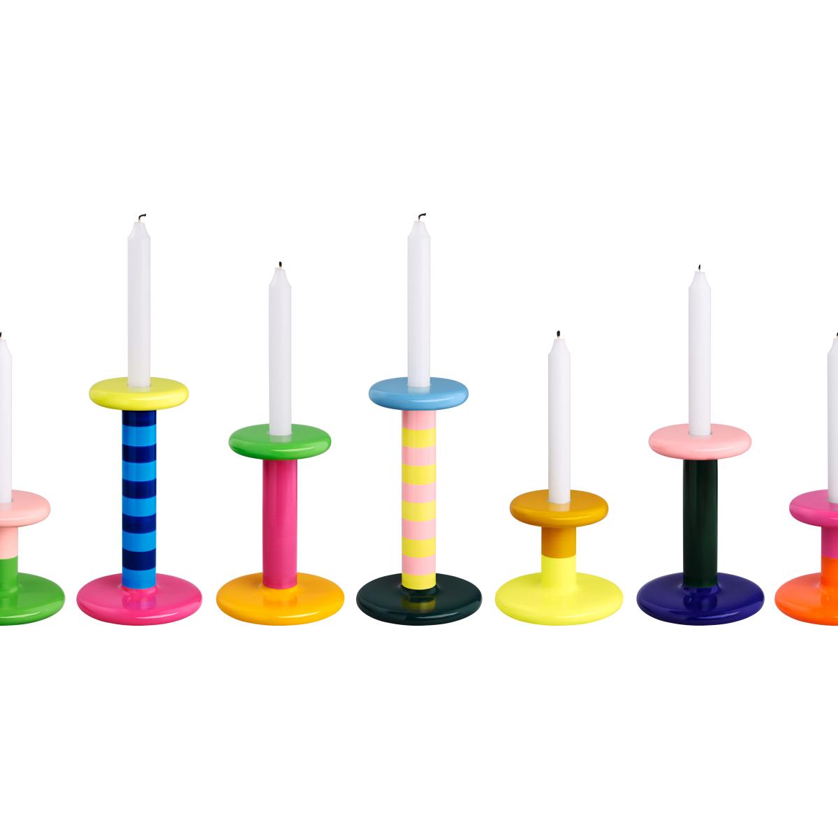Pesa candlestick Medium 18 cm from Hem is a hand-painted candlestick in solid beech wood designed by Fabien Cappello. Its glossy, striped surfaces and full, artisanal shape create a tactile and decorative expression that draws the eye. The dumbbell shape makes it easy to move and place where it has the most impact. The Pesa candlestick works well alone, in pairs or in groups for a graphic focal point and makes a striking interior detail in the living room or on the dining table.