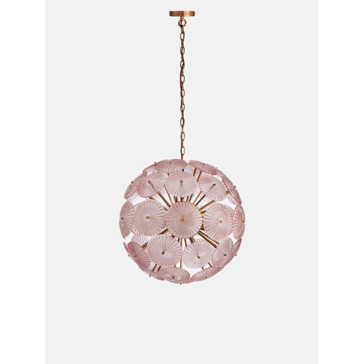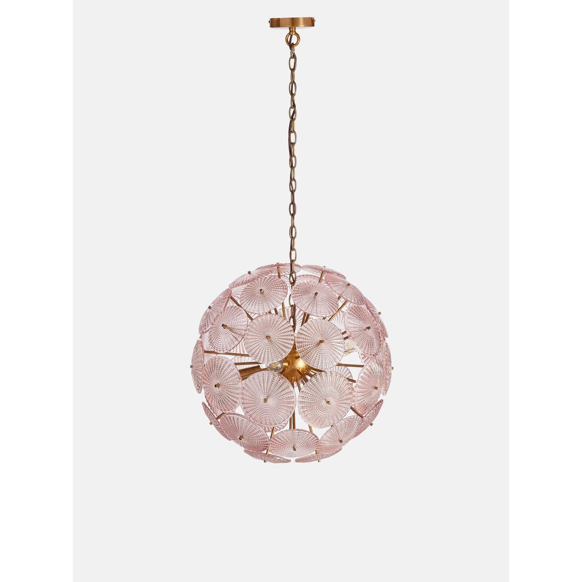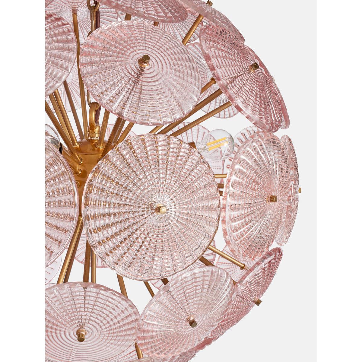 Referencing the chandeliers at Soho Warehouse in Downtown LA and1960s Italian lighting, Hemington makes a statement by day andnight. Rose glass discs mounted on brass spines radiate out in astarburst, casting a soft diffused light in any space. Italian Modernist-style chandelier. Faceted rose glass circles. Antique brass finish frame and chain. Requires 6 / E27 / Max 6. W. Inspired by Soho Warehouse.