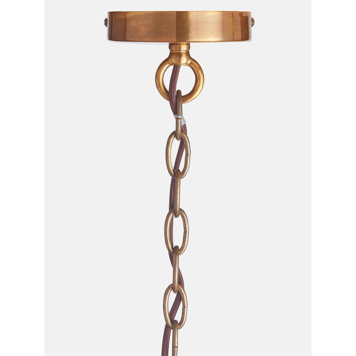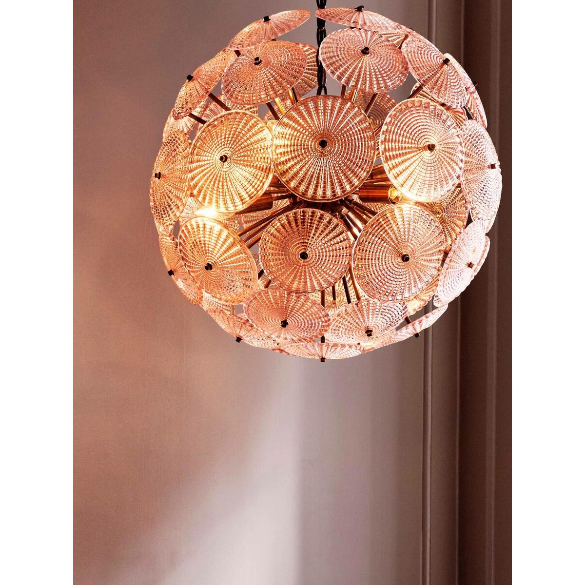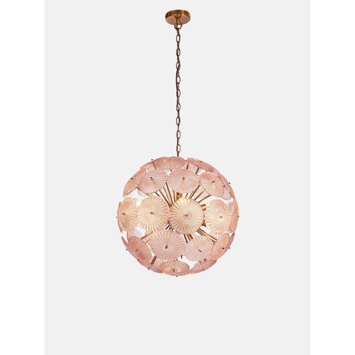 Referencing the chandeliers at Soho Warehouse in Downtown LA and1960s Italian lighting, Hemington makes a statement by day andnight. Rose glass discs mounted on brass spines radiate out in astarburst, casting a soft diffused light in any space. Italian Modernist-style chandelier. Faceted rose glass circles. Antique brass finish frame and chain. Requires 6 / E27 / Max 6. W. Inspired by Soho Warehouse.