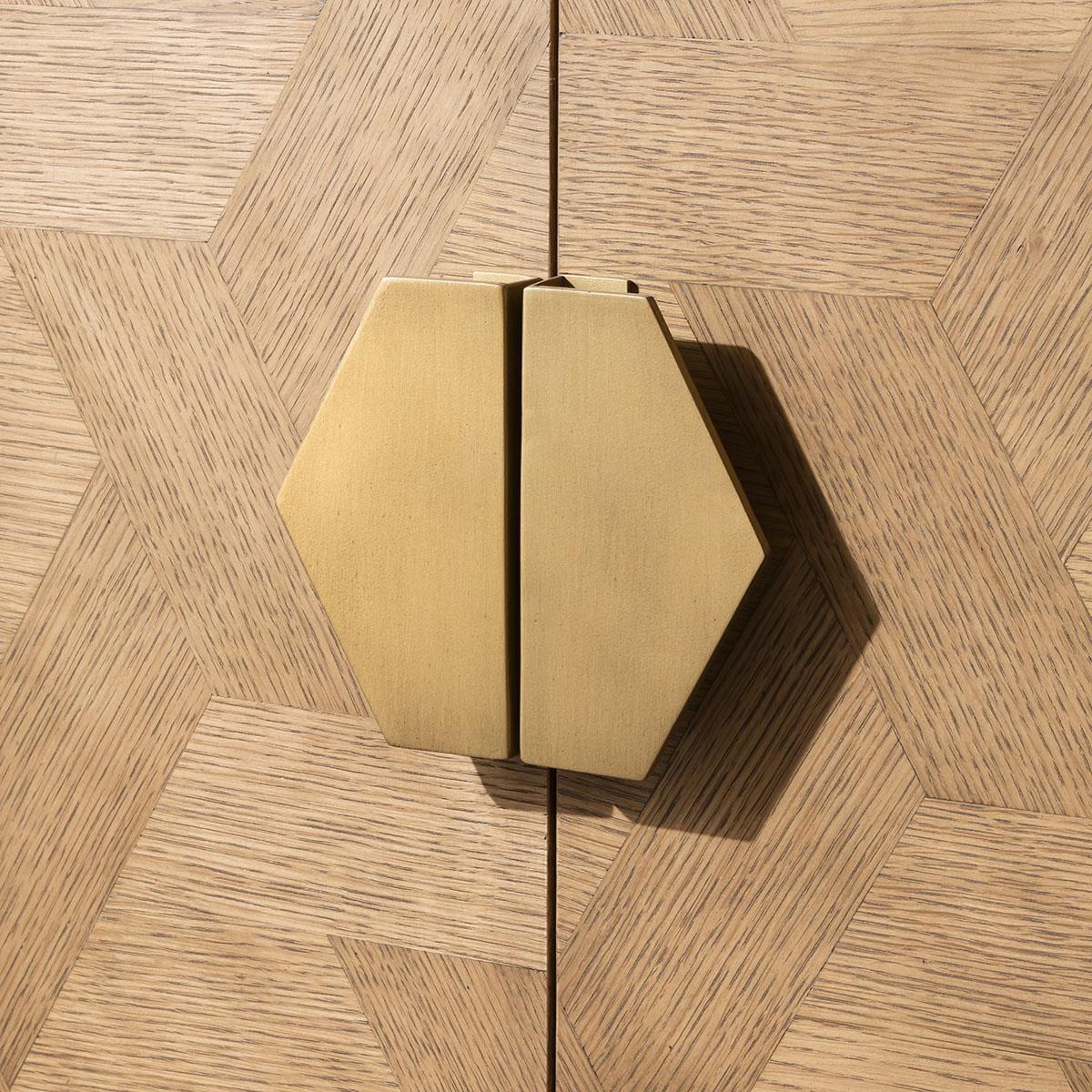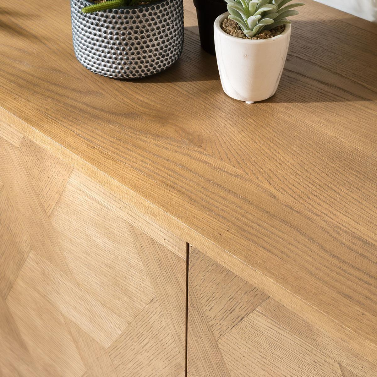 The Hemingway 4-door sideboard, a 214cm wide solid oak buffet, is adorned with ornate, interwoven parquetry fronts, each door housing a shelf. Its premium finish highlights the natural beauty of the wood, complemented by gold metal handles and a framework base that lend a modern touch while retaining timeless elegance. The interwoven pattern is more than just a decorative element; it's a testament to the skilled craftsmanship and attention to detail that goes into creating this piece. The precision and artistry employed in forming this design elevate the piece beyond mere functionality, turning it into a statement of artistic excellence within your living space. This sideboard marries functionality with aestheticsthe open framework base, finished in matte gold, complements the hexagonal-shaped gold accent handles, echoing the geometric motif within the parquetry. This fusion of design elements lends a contemporary touch while retaining timeless elegance. Delivered preassembled, it's ready to grace your home. With meticulous care taken in the crafting process, each detail has been expertly put together, ensuring that the sideboard arrives in its entirety, ready to be showcased in your home. W214cm D45cm H86cm Interwoven wood veneer pattern Iron framework base and handles