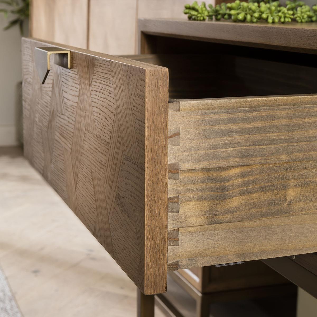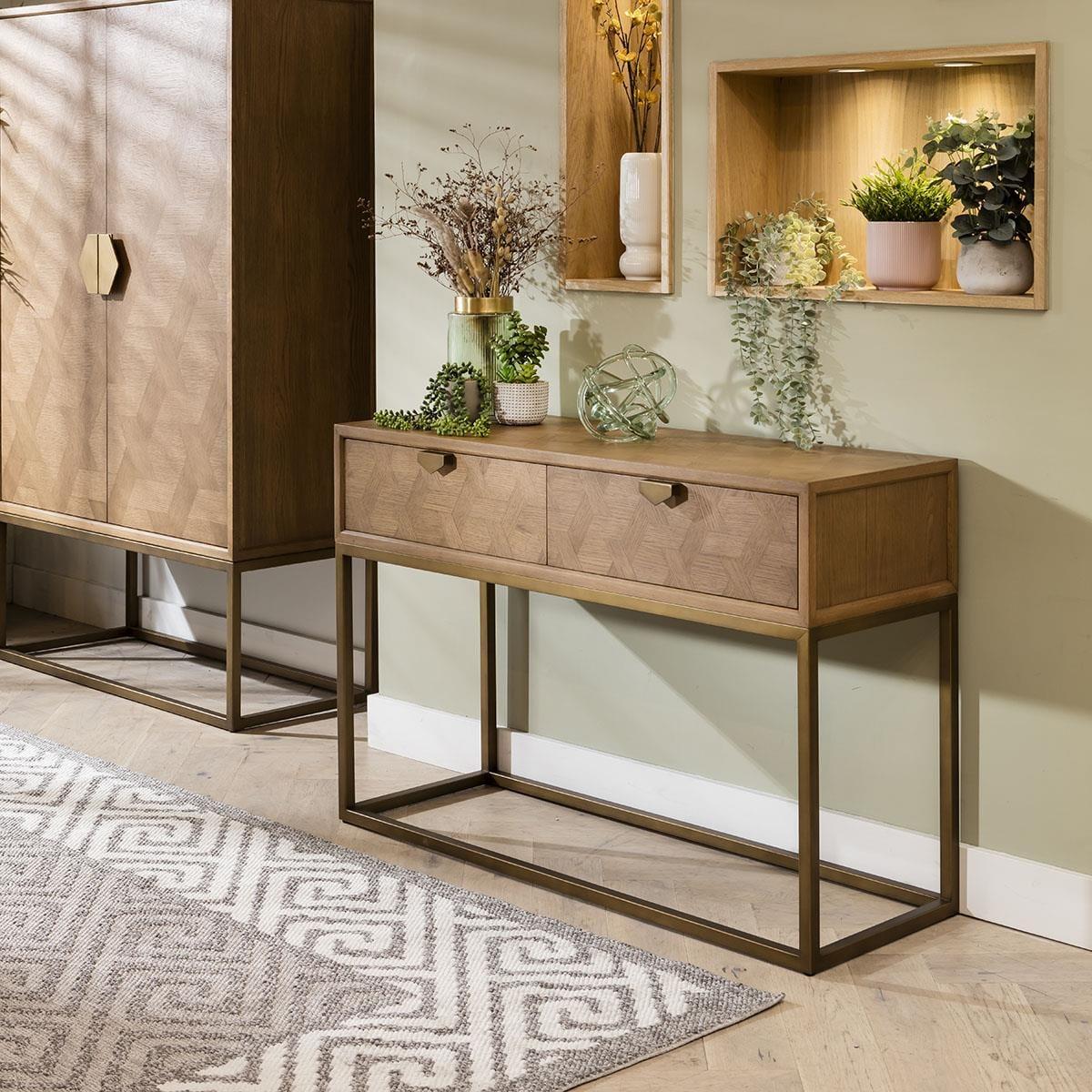 The Hemingway console table, a 120cm entrance hallway table, adorned with an ornate, interwoven parquetry front, and spacious drawer storage. Its premium finish highlights the natural beauty of the wood, complemented by gold metal handles and a framework base that lend a modern touch while retaining timeless elegance. The interwoven pattern is more than just a decorative element; it's a testament to the skilled craftsmanship and attention to detail that goes into creating this piece. The precision and artistry employed in forming this design elevate the piece beyond mere functionality, turning it into a statement of artistic excellence within your living space. This console table marries functionality with aestheticsthe open framework base, finished in matte gold, complements the hexagonal-shaped gold accent handles, echoing the geometric motif within the parquetry. This fusion of design elements lends a contemporary touch while retaining timeless elegance. Delivered preassembled, it's ready to grace your home. With meticulous care taken in the crafting process, each detail has been expertly put together, ensuring that the table arrives in its entirety, ready to be showcased in your home. W120cm D42cm H80cm Interwoven wood veneer pattern Iron framework base and handles