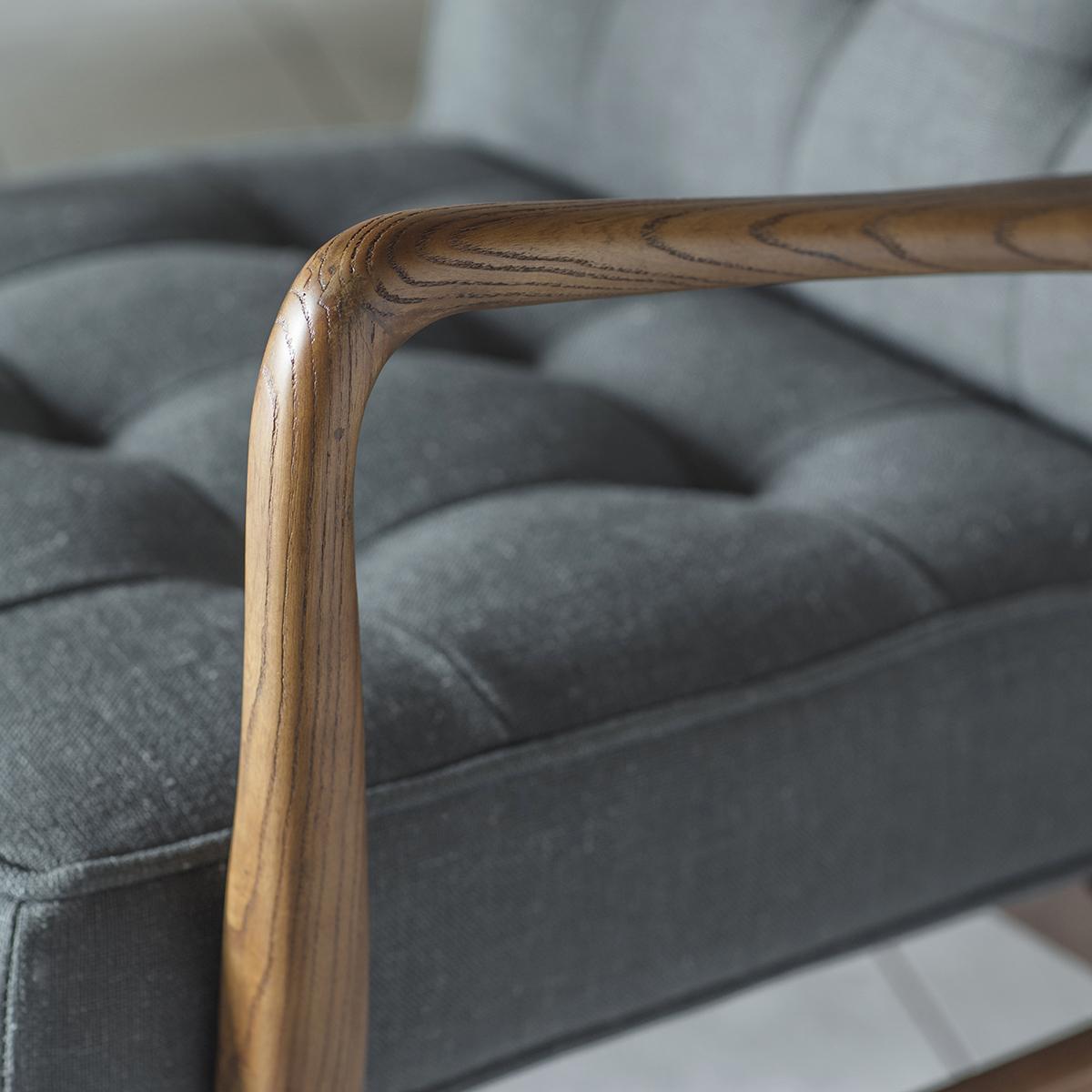 Mid century stand out personality piece with a solid oak angled frame twinned with soft dark grey linen upholstery and decorative deep pull detailing.