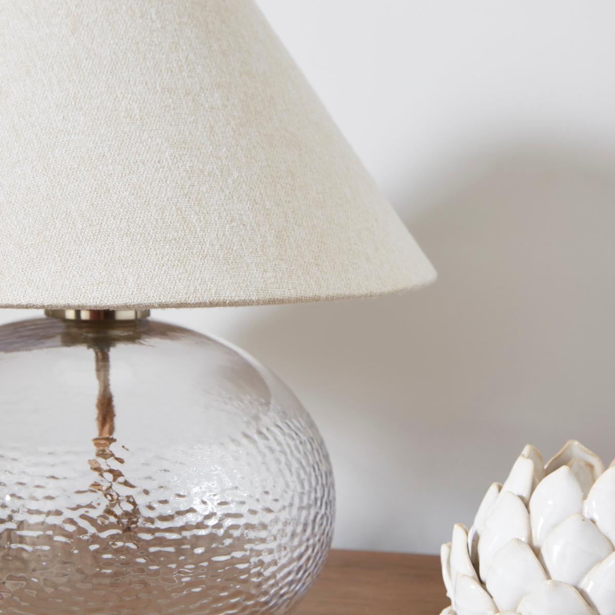 * Traditional, Ribbed Design* Soft, Round Base* Includes Beautiful Tapered Shade* Requires: E14 Cap Type & Candle Bulb Featuring a ribbed glass base in a soft shape inspired by water, the Hemsby Mid Century Table Lamp comes complete with a gorgeous, natural-coloured tapered shade.
