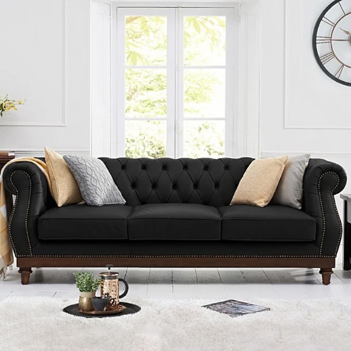 The Henbury Chesterfield Black Leather 3 Seater Sofa is a classic option perfect for the family home. Featuring black leather upholstery and classic Chesterfield design elements, the large sofa is complete with deep filled seat cushions for maximum comfort. Large sofa with classic Chesterfield design Smooth black leather covering Deep filled seat cushions for a comfortable sit Rolled armrests and buttoning for a vintage look Dark solid wood feet and metal studs complete the style Matching Armchair and 2 seater sofa available