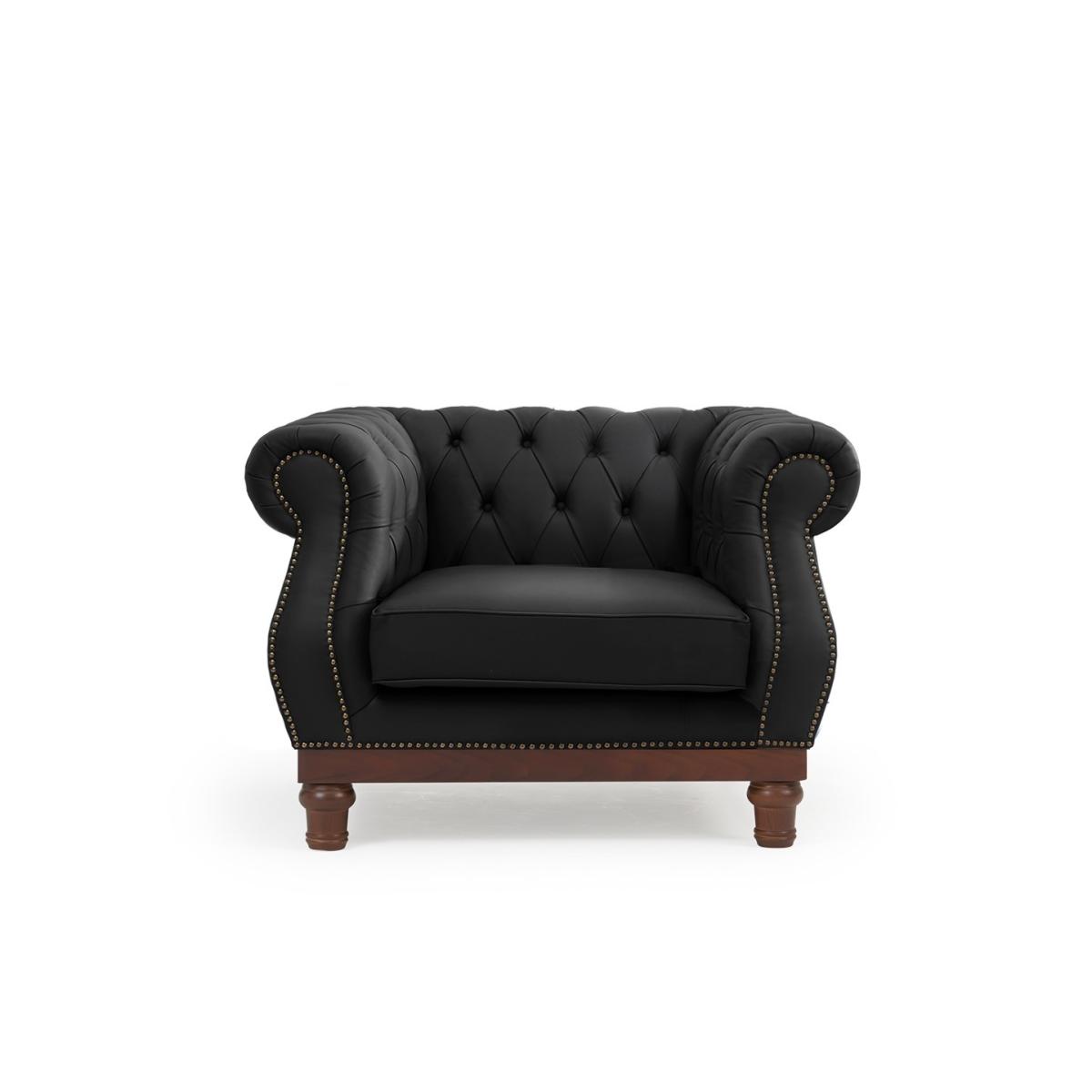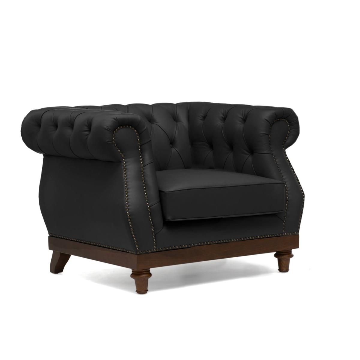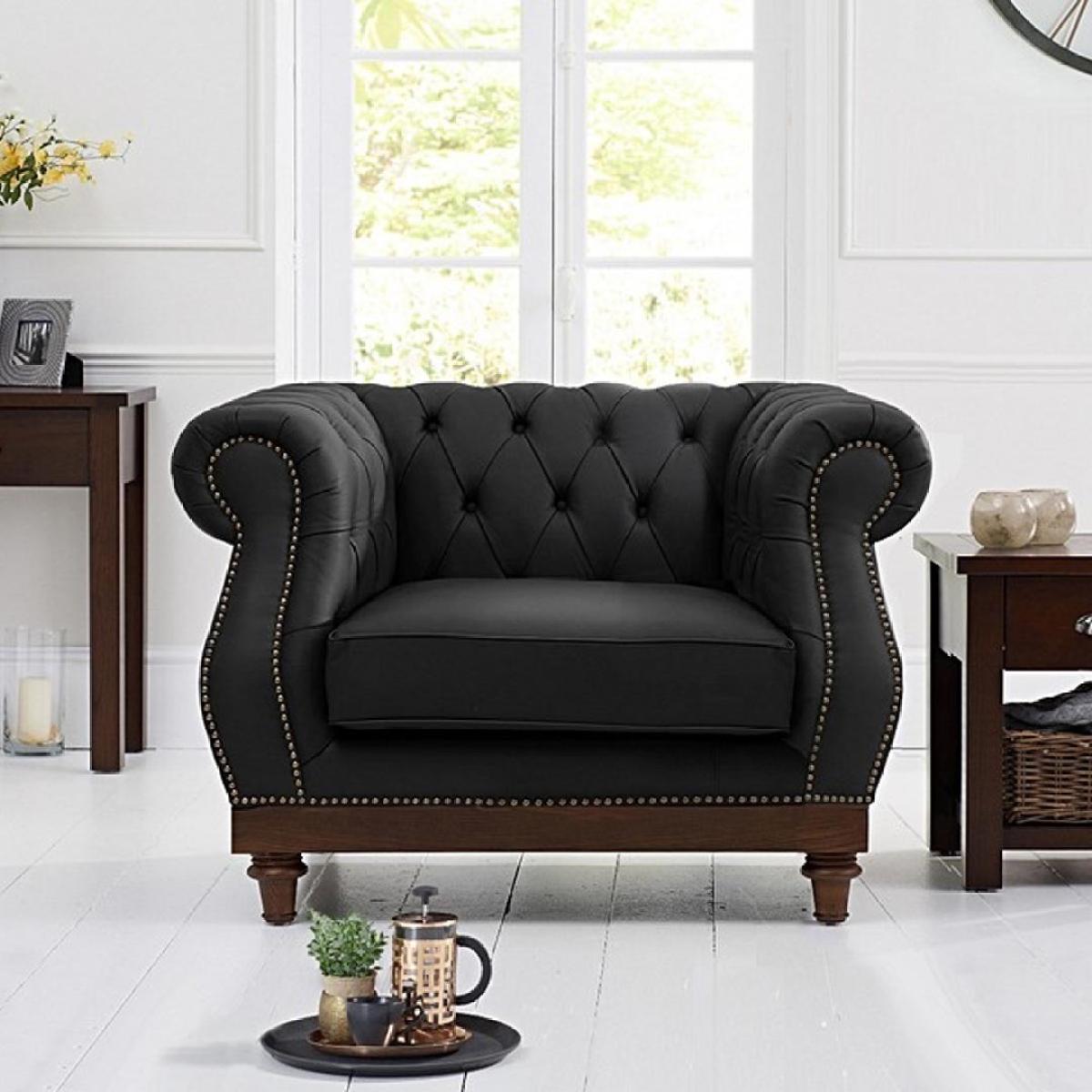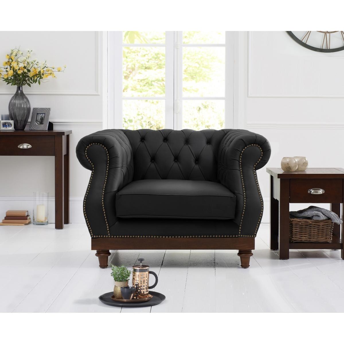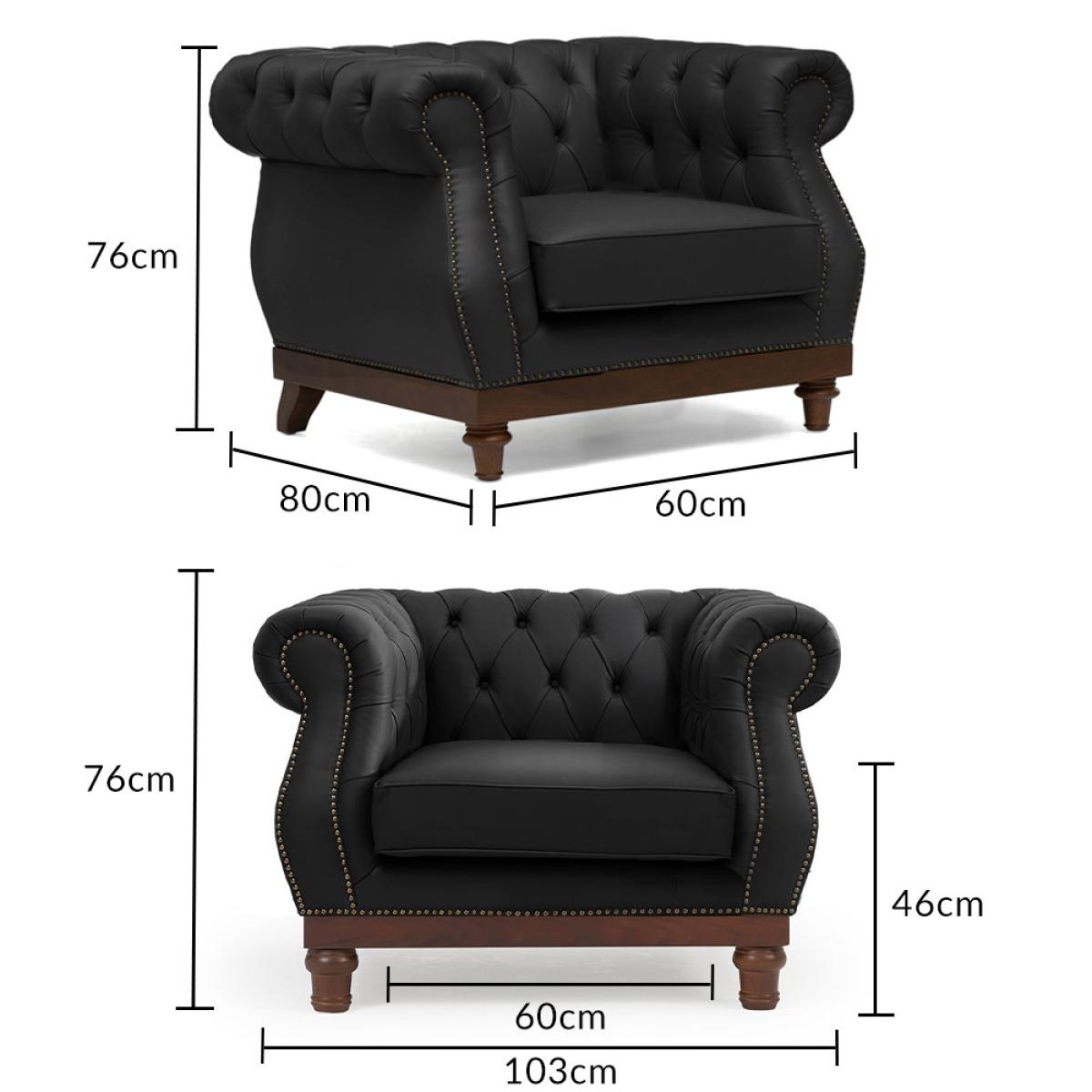 The Henbury Chesterfield Black Leather Armchair brings classic style and comfort to your living room. With smooth black leather and that unmistakable Chesterfield design, the Henbury Armchair is a stunning choice for any home. Classically stylish armchair Traditional Chesterfield design suits any interior Smooth black leather upholstery Generously padded seat cushion offers a comfortable sit Rolled armrests and deep buttoning for a vintage look Dark wood feet and metal studs complete the style Matching 2 seater and 3 seater sofas available