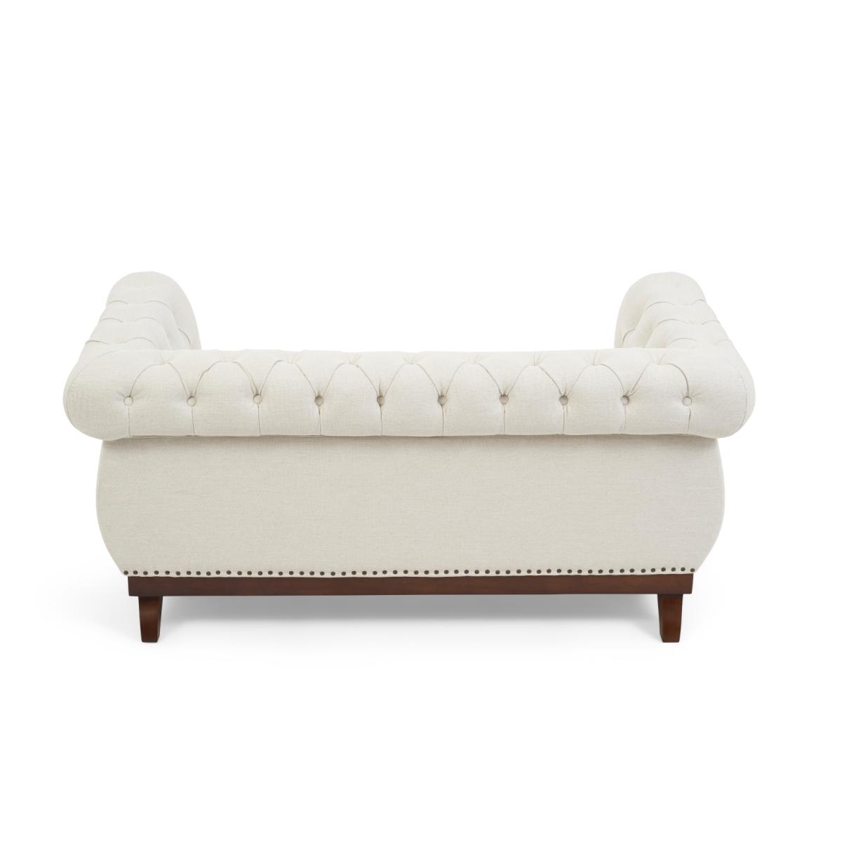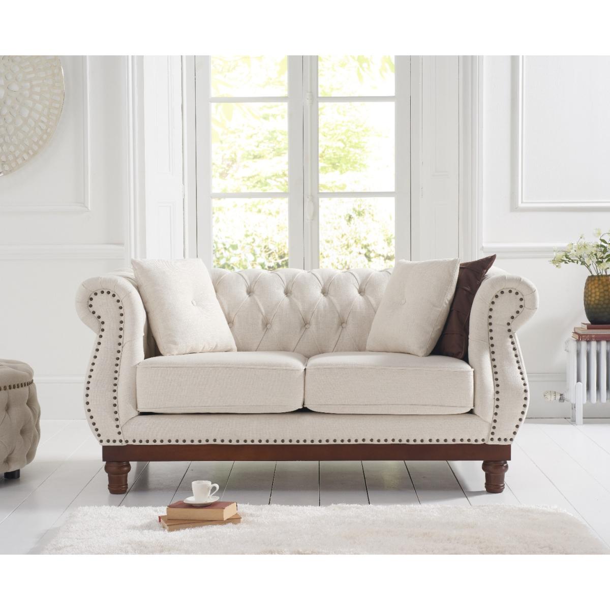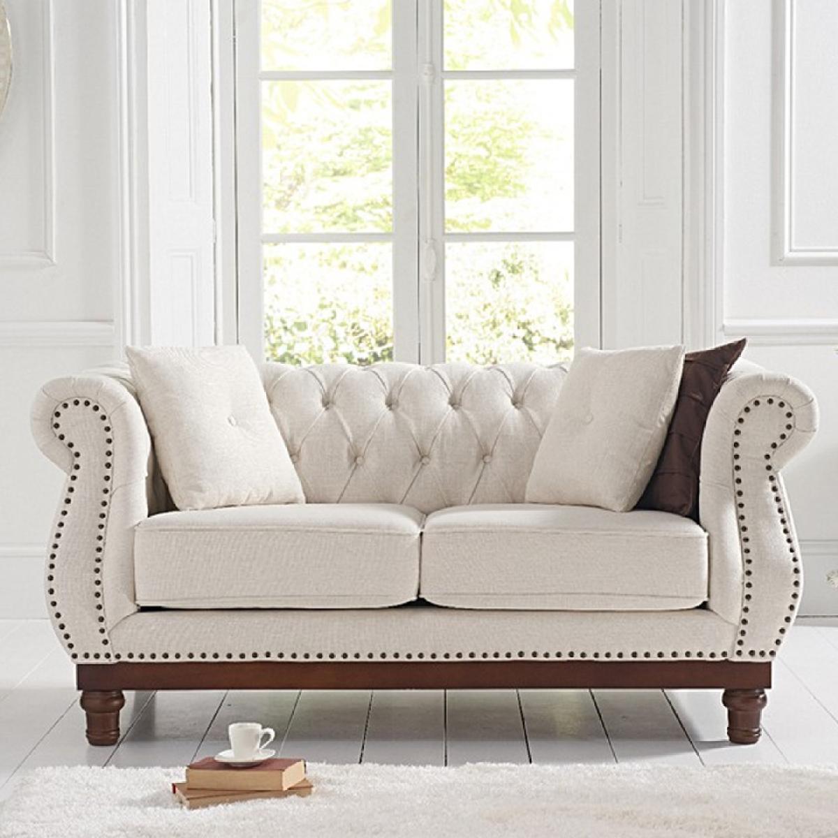 The Henbury 2 Seater Sofa in our beautiful Ivory Linen fabrication boasts classic Chesterfield styling and contemporary finishes for a modern update. Deeply inset buttons cover the plump backrest and scrolled arms, and 3 foam-filled cushions make for a cosy, elegant addition to any stylish living space. Supported by an ash wood base and low, sturdy legs, and finished with a stylish metal studded trim. Light and smooth linen upholstery offers timeless elegance, as well as a refreshingly cool and soft feel. Sophisticated Chesterfield elements combined with modern studded trims make for a completely unique piece. 2 deep, foam-filled cushioned seats and high, curved arms means the ultimate in cosy lounging. We Love: Styled with the matching Henbury Ivory Linen 3 Seater Sofa, and Henbury Ivory Linen Armchair for a full suite. Also available: Ivory Linen 3 Seater Sofa, Ivory Linen Armchair