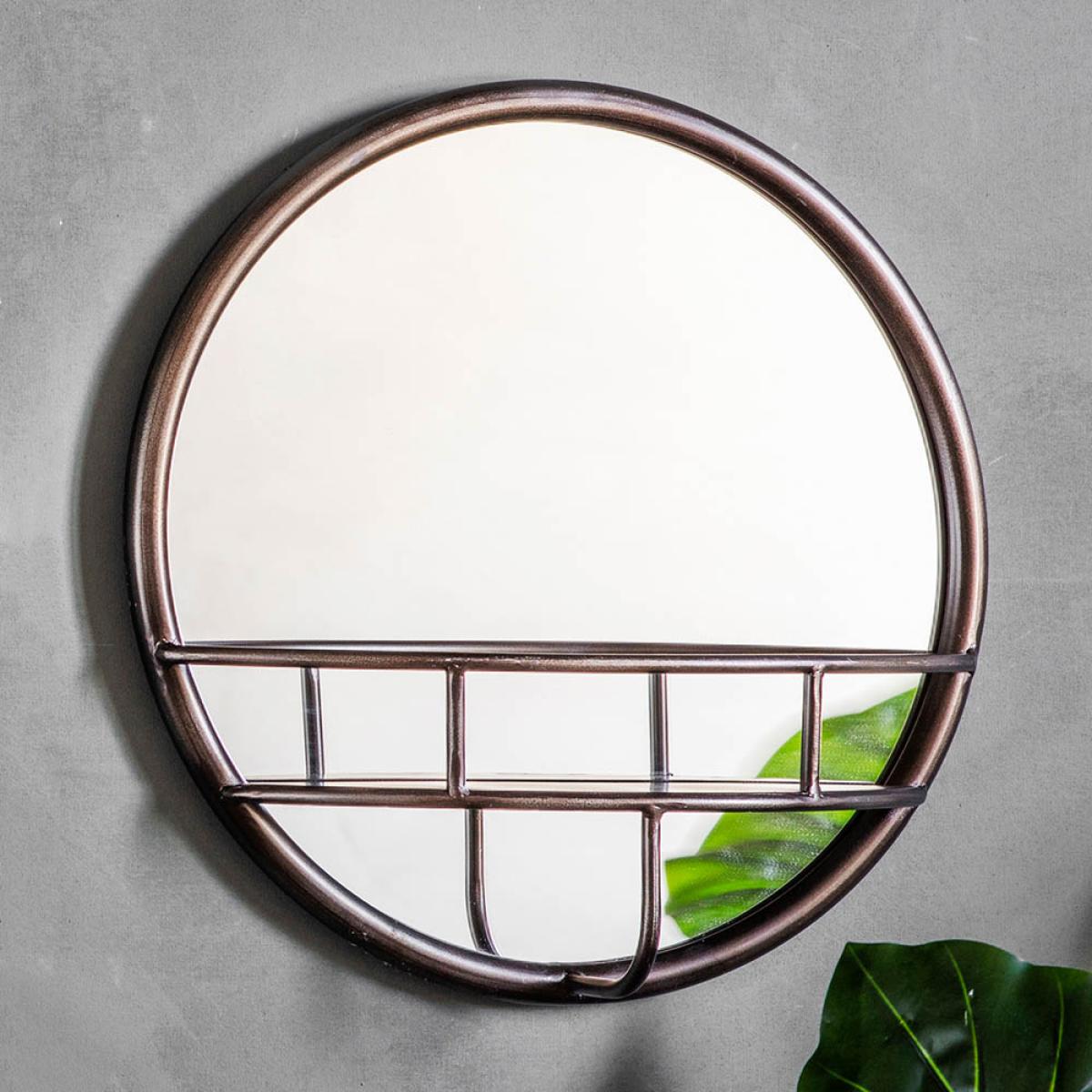 Compact design mirror with protruding shelf. Ideal for bathrooms and vanity spaces. The rustic bronze metal finish provides a cool industrial feel. Shape: Round. Material: Glass, Iron. Colour/Finish: Bronze. Mount Type: Wall.
