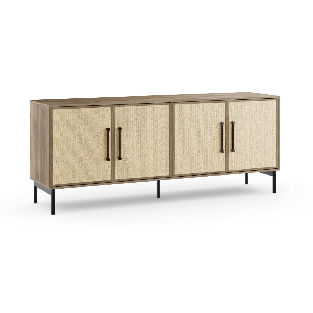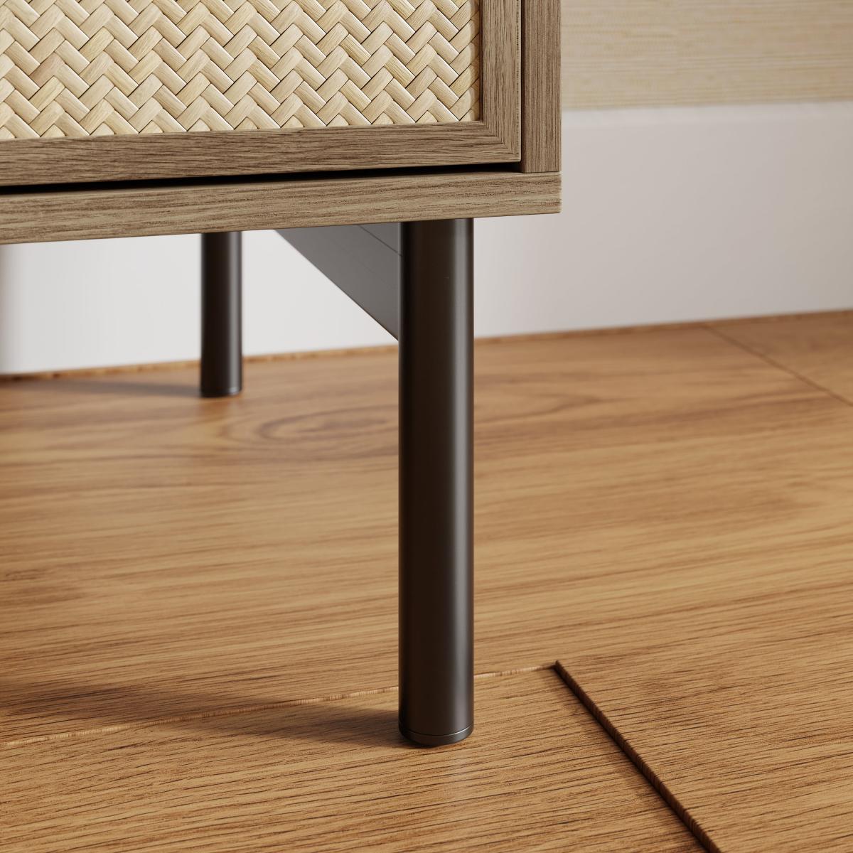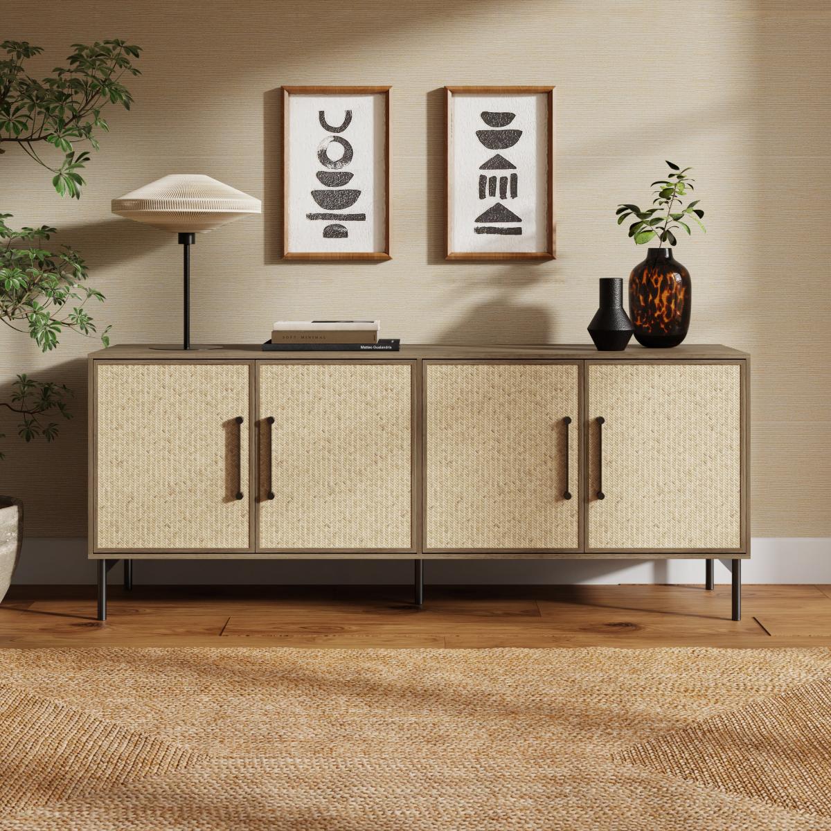 * Rattan design * Wooden frame * Metal legs With its generous storage and relaxed boho feel, this large sideboard makes an easy addition to any dining room, lounge or even a spacious hallway. The rattan-fronted doors offer a lovely bit of texture and warmth, while the black metal legs and sleek handles keep things looking clean and contemporary. Whether you’re hiding away tableware, games, or that one drawer of ‘random stuff’, this sideboard has the space to handle it all—without compromising on style.
