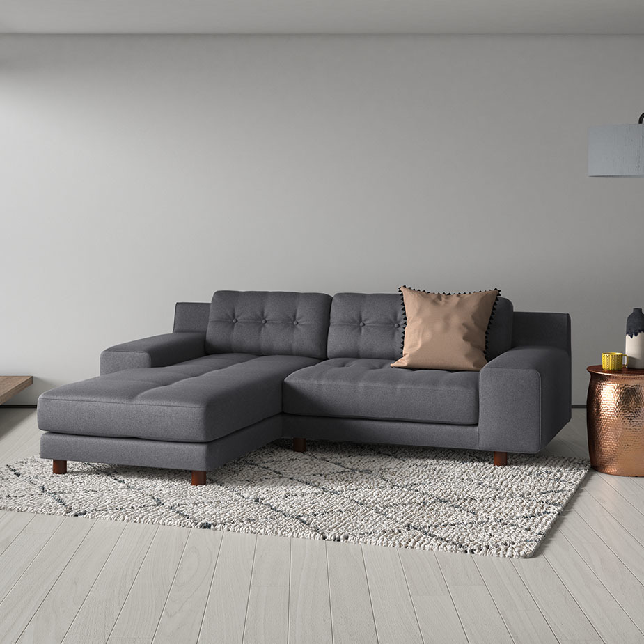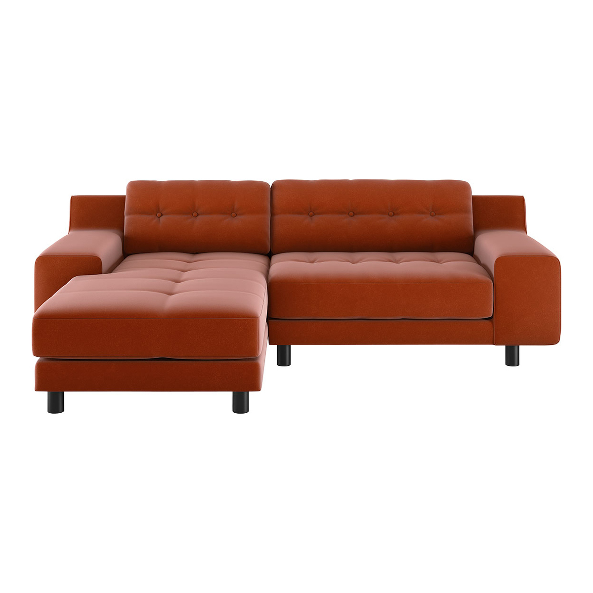 The sumptuous Hendricks orange velvet small left arm chaise sofa, features low, wide arms and soft, deep feather and fibre cushions finished with button detailing. Made in Italy, this sofa has a substantial, retro-styled design and is fully upholstered with removable frame covers. Getting a sofa into your home can sometimes be a bit of a squeeze. Read our Sofa Measuring Guide to ensure your dream design is compatible with your space. Part of the Hendricks range and available in a choice of fabrics and leathers in a variety of colours and sizes.