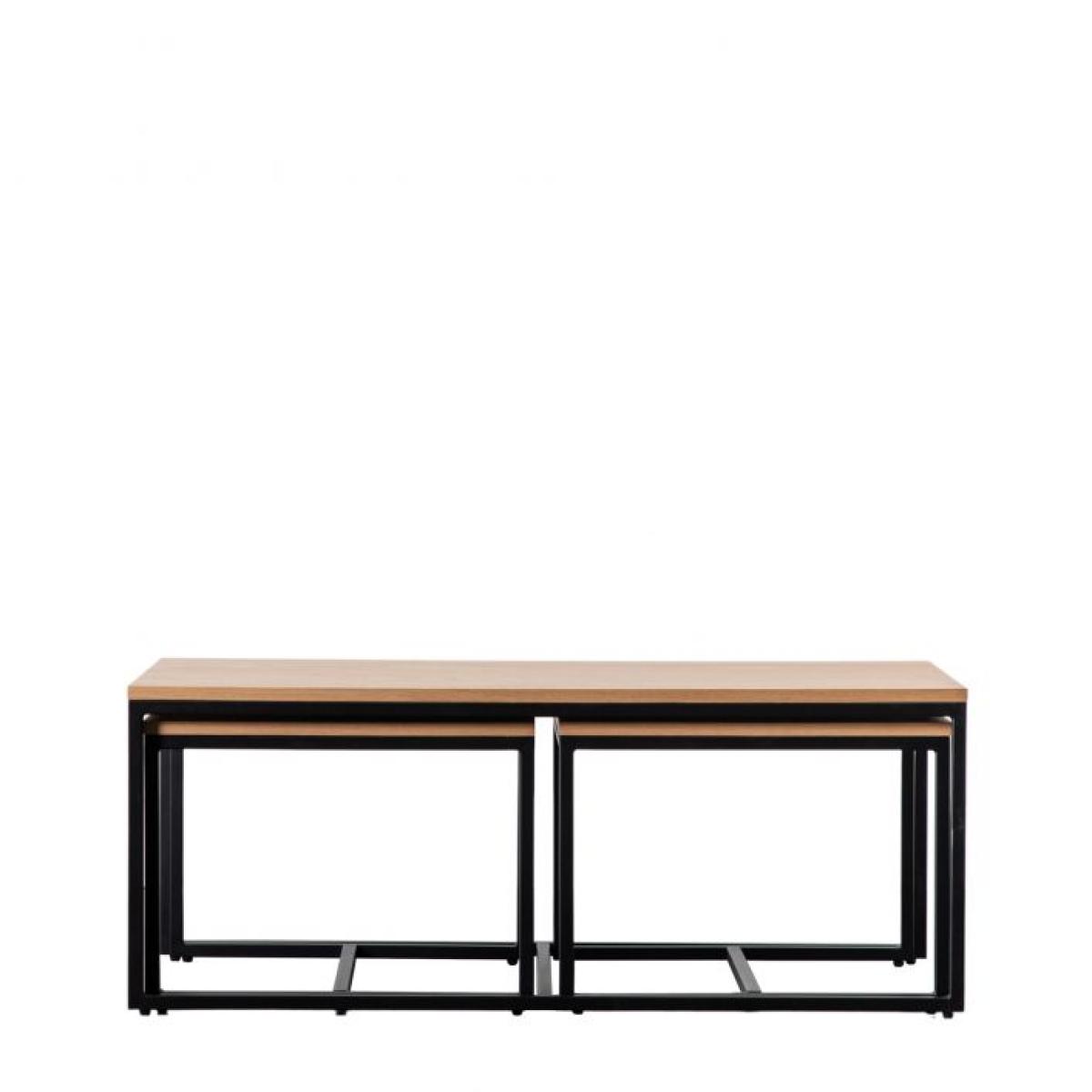 This stunning nest of tables combines clean sharp lines with natural oak veneer tops and matt black metal bases to offer crisp contemporary style. It features a larger table and two smaller ones which fit underneath when not in use. It is part of a collection which offers a range of tables plus a display unit. The collection is part of our Packed-Flat Design Project, offering easy delivery to any room in any property, whilst reducing the packaging needed. Easy assembly is required, but all the tools needed are supplied.