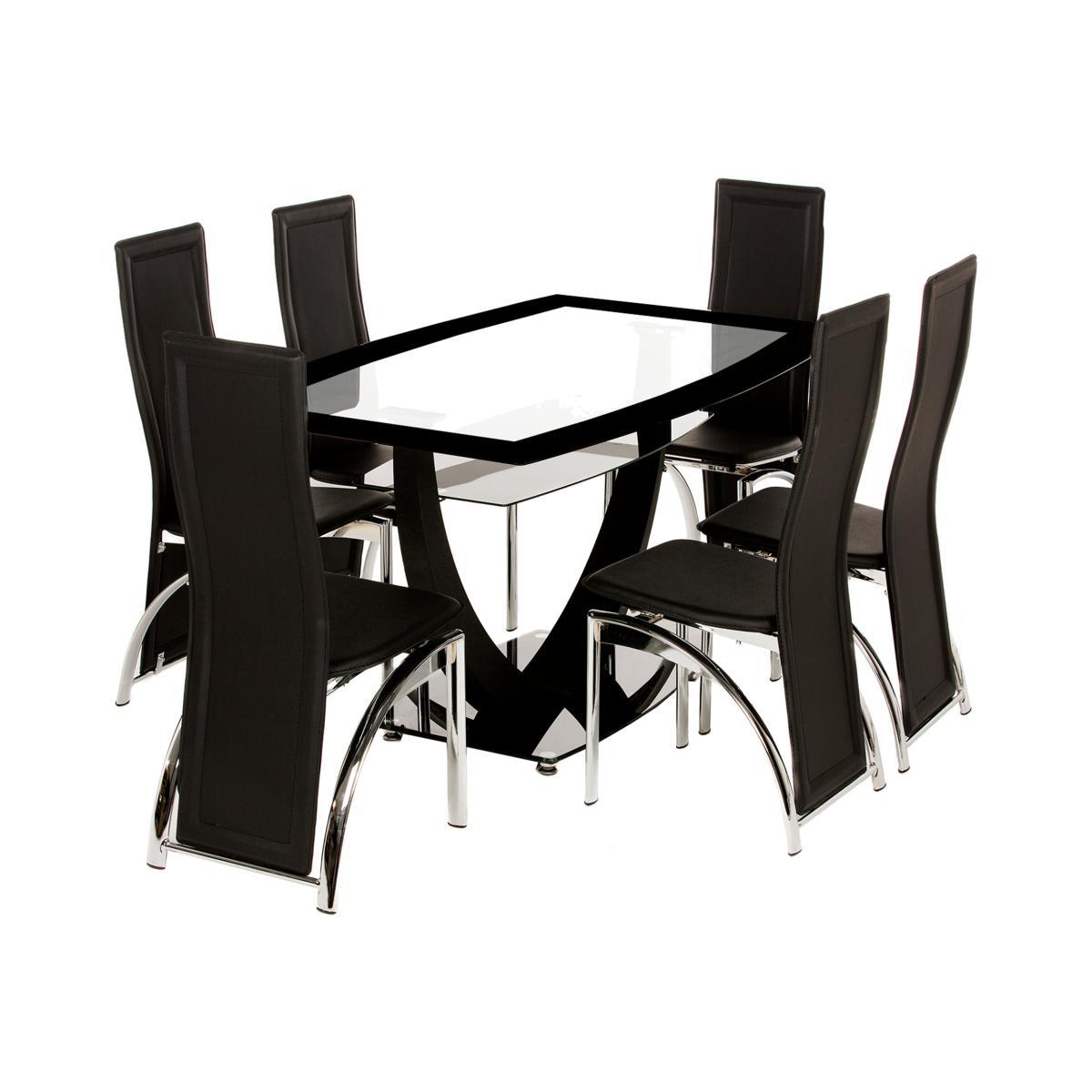 Full of contemporary character, the Henley 6 Seater Glass Dining Set has a sleek design that will fit perfectly in the modern home. The table has a tempered glass top which has glossy edges and a uniquely shaped metal frame while the chair has a high back with chrome legs and faux leather upholstery. Please note, unfortunately we cannot deliver this item to the Channel Islands.