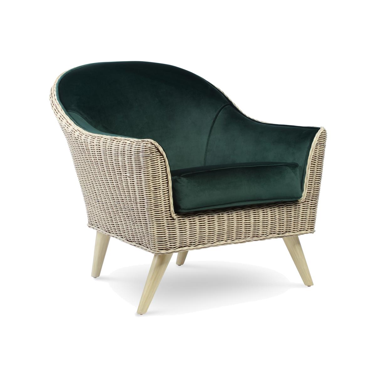 A sustainable natural rattan tub chair with a woven wicker frame and velvet green seat.