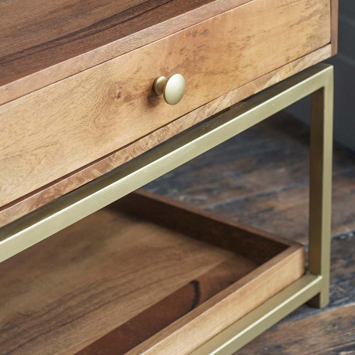 Give the living room a stunning focal point with our vintage-style Henley Coffee Table, which is lovingly crafted from mango wood, with a brass powder coated iron frame and comes with two handy drawers as well as an open floating shelf below. There’s masses of space for storage and a generously sized surface on top for drinks, nibbles or playing board games on a rainy day. For a co-ordinated look, we also have a matching console and bedside table, perfect for giving your home that rustic, laid-back finish.